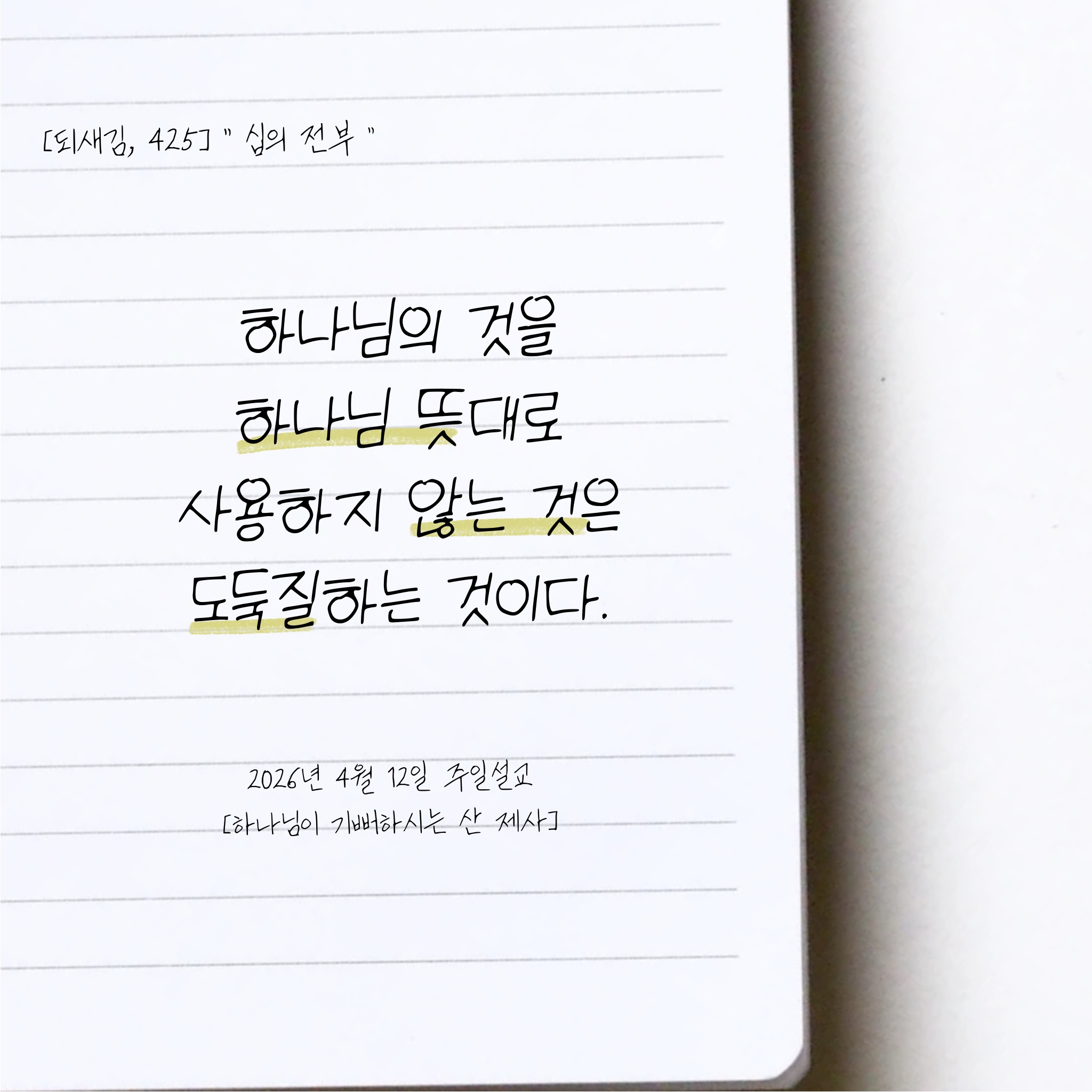 우리가 하나님 앞에 신앙생활하는데 하나님 것인지 내 것인지 구별을 못하면은 그게 도적이에요. 말라기 3장에 (말 3:8) ‘너희는 나의 것을 도적질하고도’ 그랬잖아요. 그러니까 이스라엘 백성들이 ‘우리가 어떻게 주의 것을 도적질하였나이까’ 그랬거든요, 뻔뻔스럽게. ‘우리가 어떻게 주의 것을 도적질하였나이까 하도다 이는 곧 십일조와 헌물이라’ 율법에 십일조는 하나님의 것으로 구별했거든요. 그리고 마땅히 하나님께 바쳐야 될 헌물, 그것을 자기 것이라고 생각하는 건 하나님 것을 도적질하는 거다.