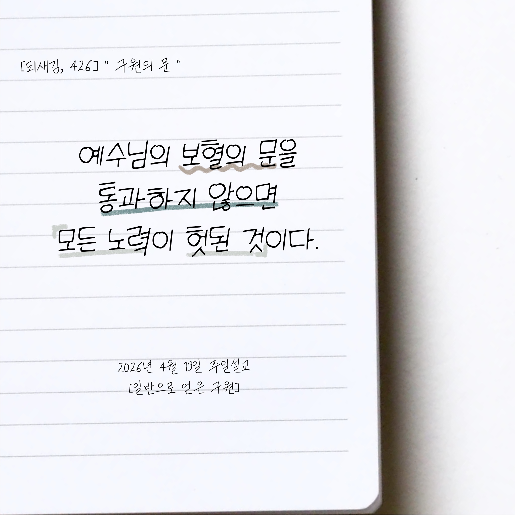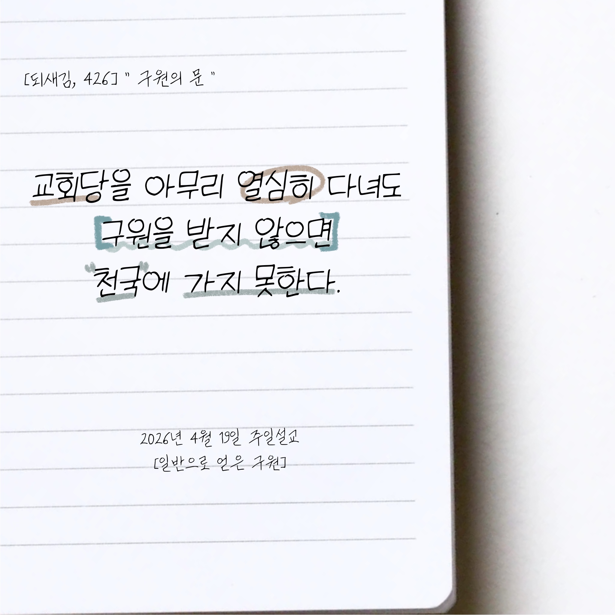 구원이라는 것은 그렇게 중요한 거예요. (히 2:3) ‘이같이 큰 구원을 등한히 여기면 어찌 피하리요’ 히브리서 2장 3절에 있는 말씀대로 큰 구원입니다. 우선 하나님은 그것부터 따지는 거예요. 어떤 목사님 부부가 전도하러 나갔대요. 문을 다 이제 자물쇠로 잠가놓고, 그리고 밤에 이제 돌아와 봤는데 집에 불이 켜져 있고 세 사람이 거기서 왔다 갔다 하면서 있는 거예요. “어? 우리 집에 어떤 사람이 와 있지? 열쇠는 우리밖에 없는데?” 그래서 이제 문을 열고 들어왔어요. “아 목사님, 이제 오세요. 목사님 그렇게 고생하시고 그래서 저희들이 밥도 지어놓고 청소도 해놓고 빨래도 해놓고 했어요.” 그럼 목사님이 하는 말이 뭐예요? “아, 고맙습니다.” 그렇게 말해요? “당신들 여기 어떻게 들어왔어? 여기 어떻게 들어왔어?” (요 10:8) ‘나보다 먼저 온 자는 다 절도요 강도니’ 그랬어요. 어떻게 들어왔어? 구원이 그렇게 중요한 거예요.