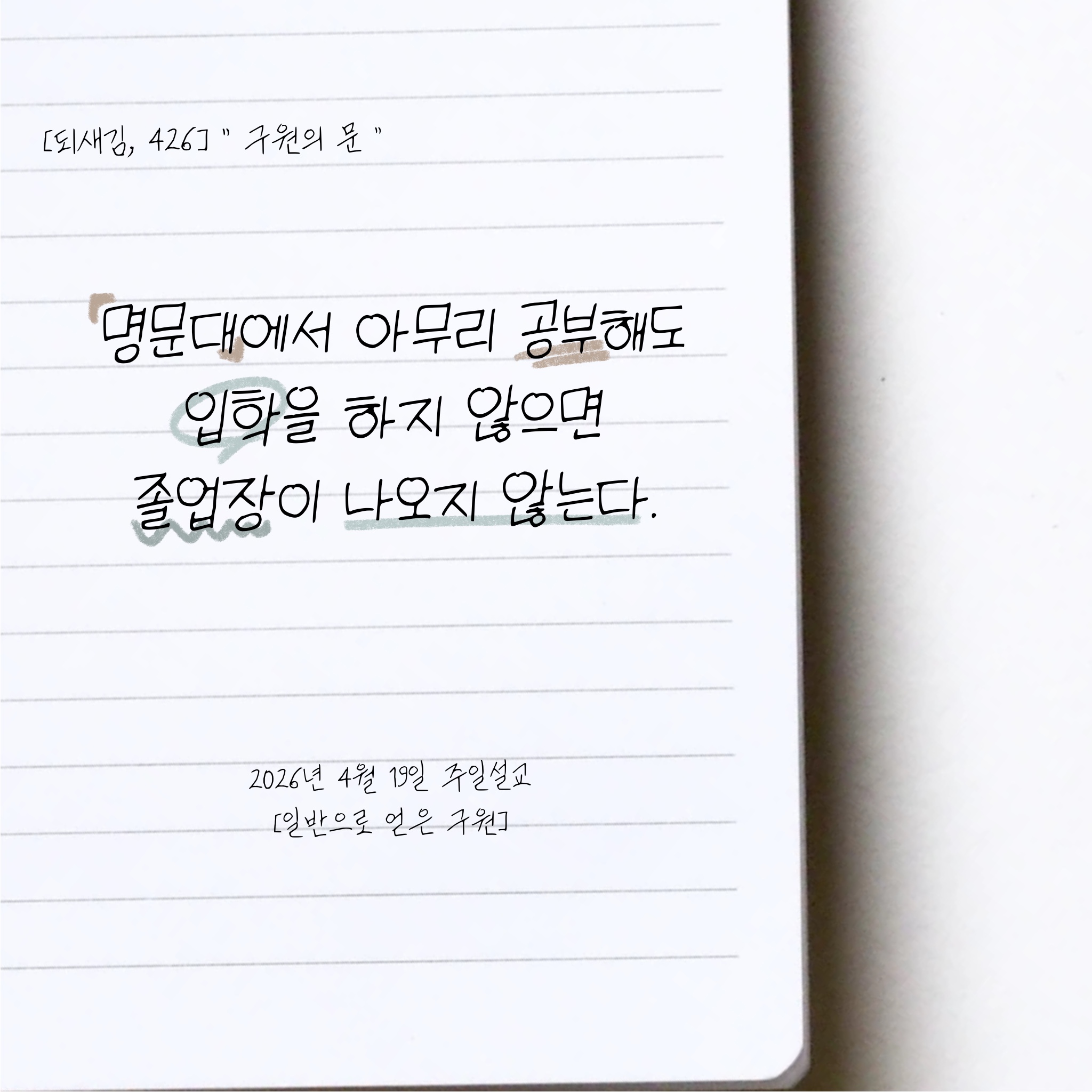 들어온 것보다 어떻게 들어왔느냐가 중요합니다. 그렇잖아요. 아무리 서울대에 가서 십 년간 공부를 해도 입학의 문을 들어가지 않으면 졸업장이 안 나온다는 사실이에요. 맞잖아요.