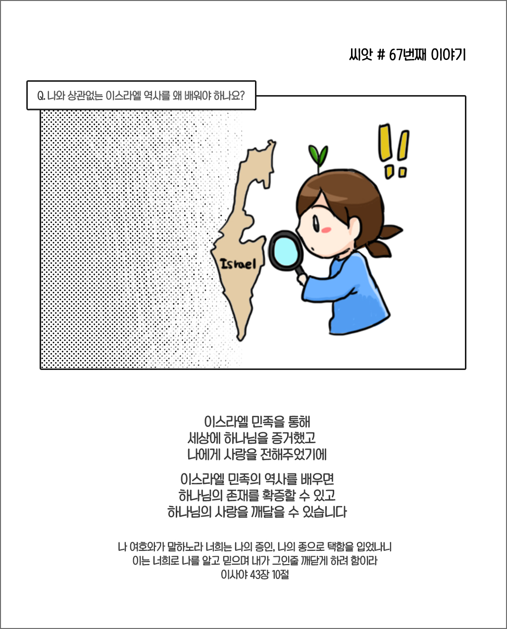 Q. 나와 상관없는 이스라엘 역사를 왜 배워야 하나요?이스라엘 민족을 통해세상에 하나님을 증거했고나에게 사랑을 전해주었기에이스라엘 민족의 역사를 배우면하나님의 존재를 확증할 수 있고하나님의 사랑을 깨달을 수 있습니다나 여호와가 말하노라 너희는 나의 증인, 나의 종으로 택함을 입었나니
