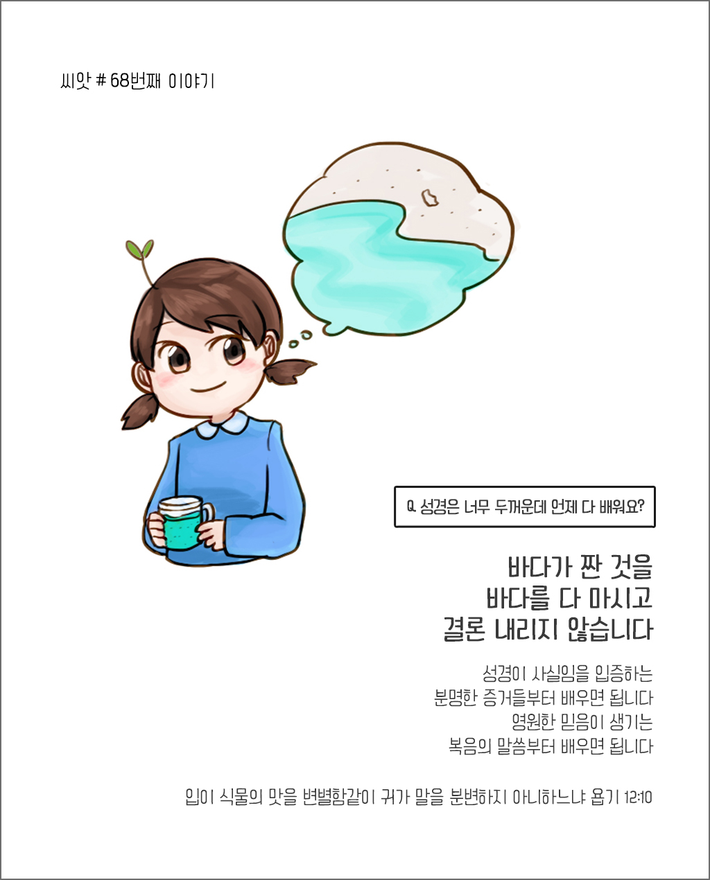 Q. 성경은 너무 두꺼운데 언제 다 배워요?바다가 짠 것을바다를 다 마시고결론 내리지 않습니다성경이 사실임을 입증하는분명한 증거들부터 배우면 됩니다영원한 믿음이 생기는복음의 말씀부터 배우면 됩니다