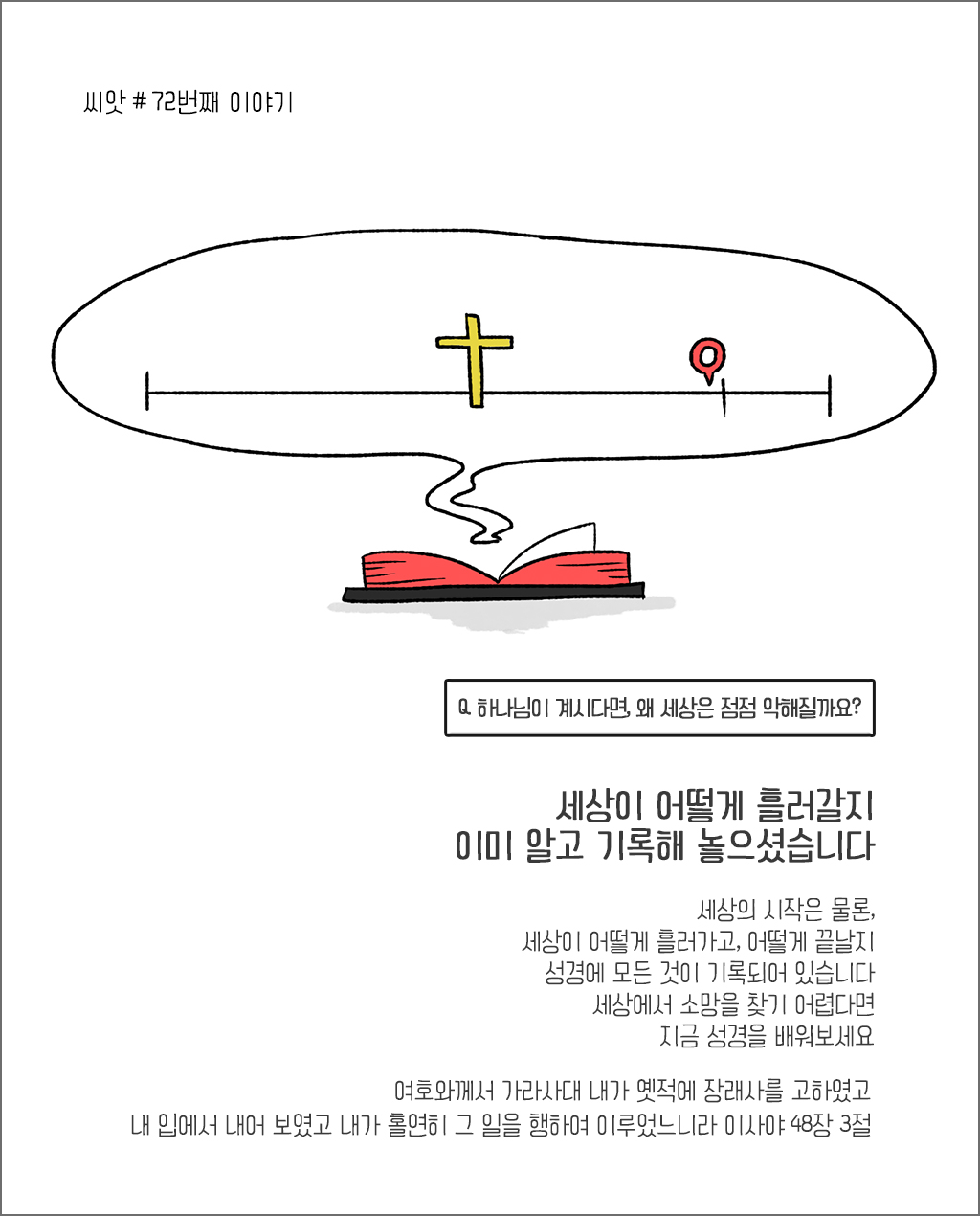 Q. 하나님이 계시다면, 왜 세상은 점점 악해질까요?세상이 어떻게 흘러갈지이미 알고 기록해 놓으셨습니다세상의 시작은 물론,세상이 어떻게 흘러가고, 어떻게 끝날지성경에 모든 것이 기록되어 있습니다세상에서 소망을 찾기 어렵다면지금 성경을 배워보세요