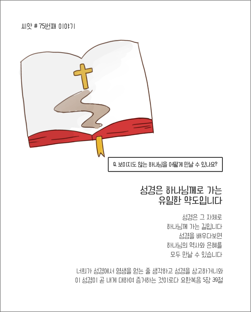 Q. 보이지도 않는 하나님을어떻게 만날 수 있나요?성경은 하나님께로 가는유일한 약도입니다성경은 그 자체로하나님께 가는 길입니다성경을 배우다 보면하나님의 역사와 은혜를모두 만날 수 있습니다