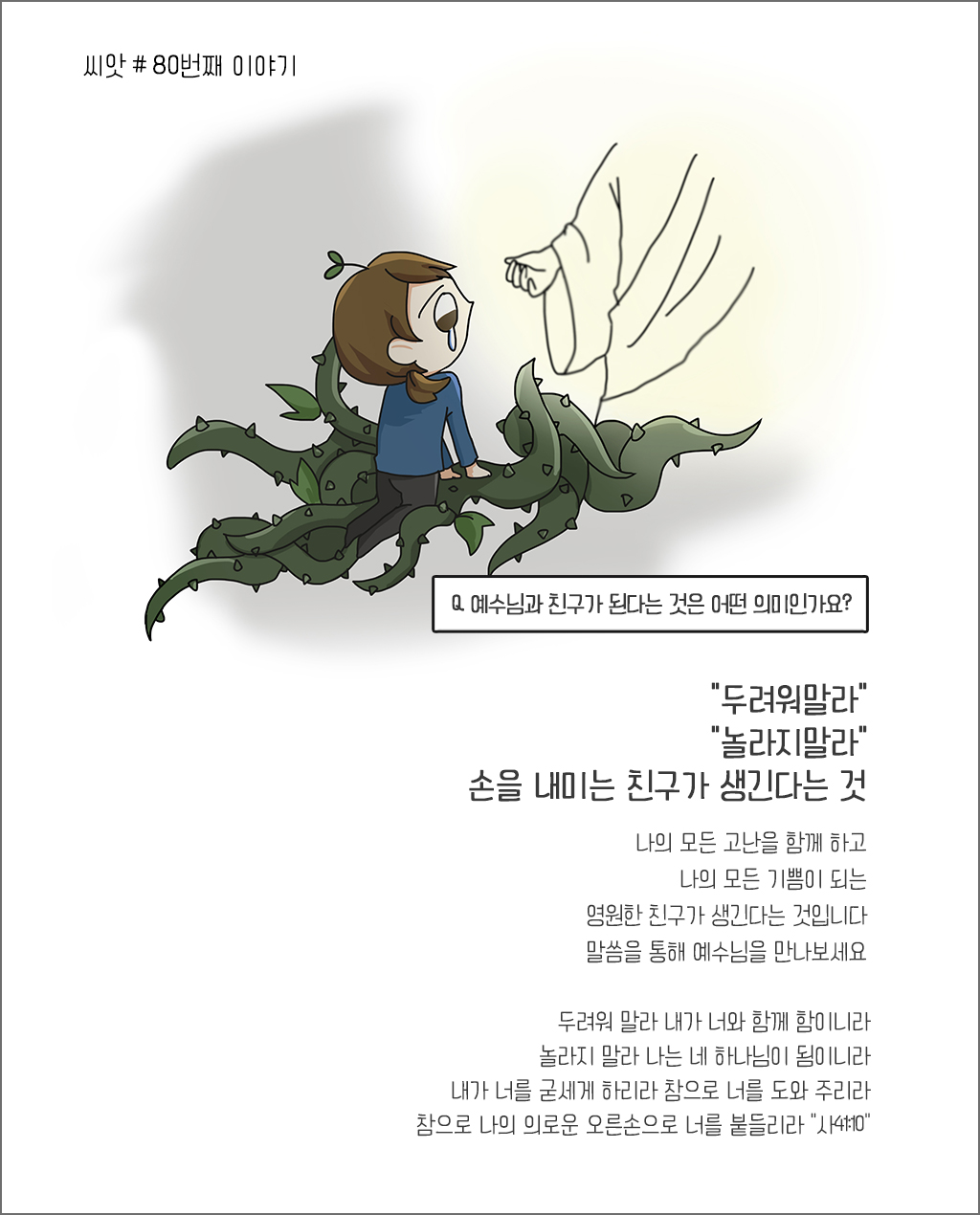 Q. 예수님과 친구가 된다는 것은 어떤 의미인가요?"두려워말라""놀라지말라"손을 내미는 친구가 생긴다는 것나의 모든 고난을 함께 하고나의 모든 기쁨이 되는영원한 친구가 생긴다는 것입니다말씀을 통해 예수님을 만나보세요