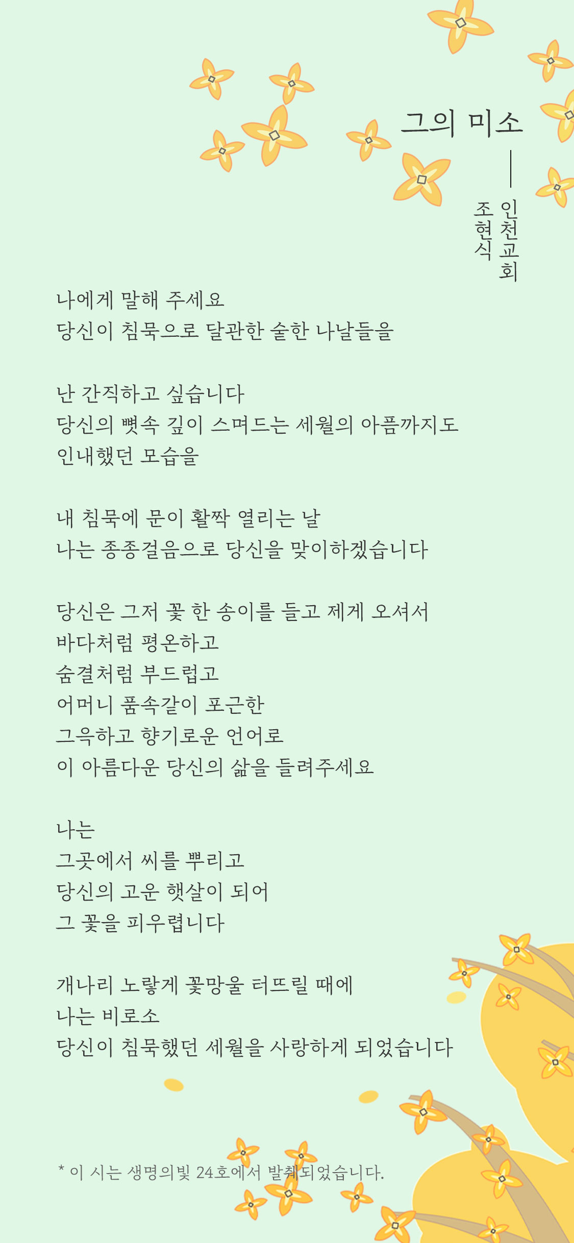 이 시는 생명의빛 24호에서 발췌되었습니다.더 많은 시를 '생명의빛' 에서 만나보세요!!생명의빛 카페 cafe.naver.com/jbchbook생명의빛 홈페이지 book.jbch.org