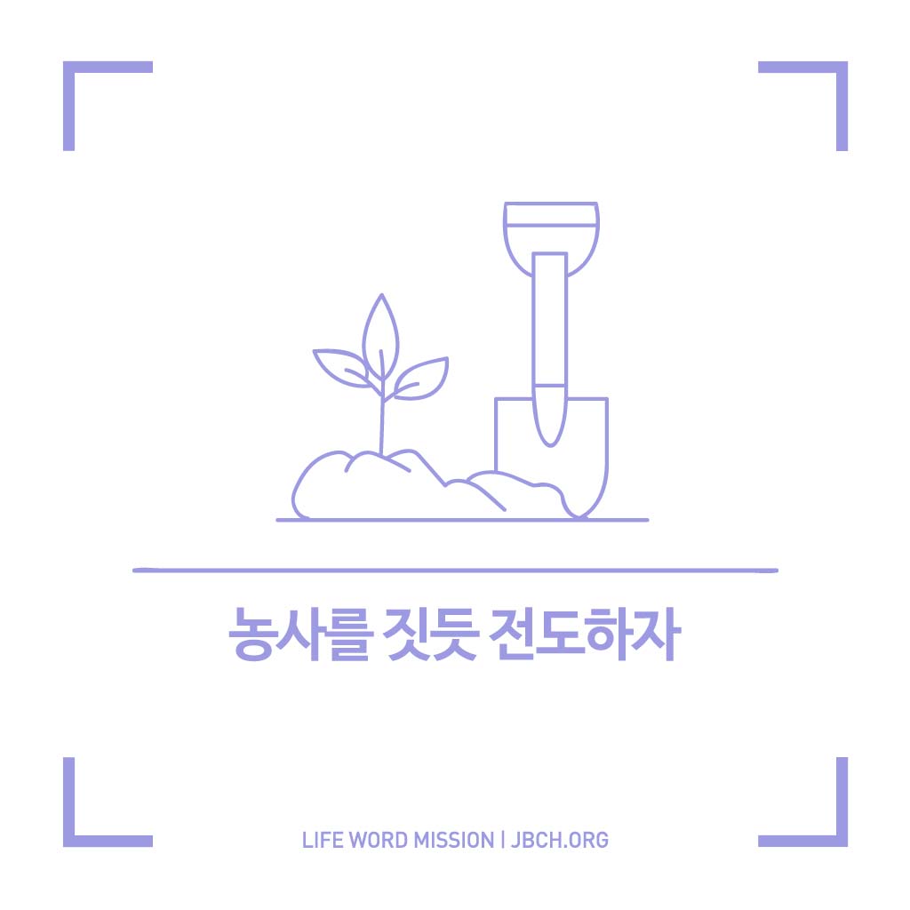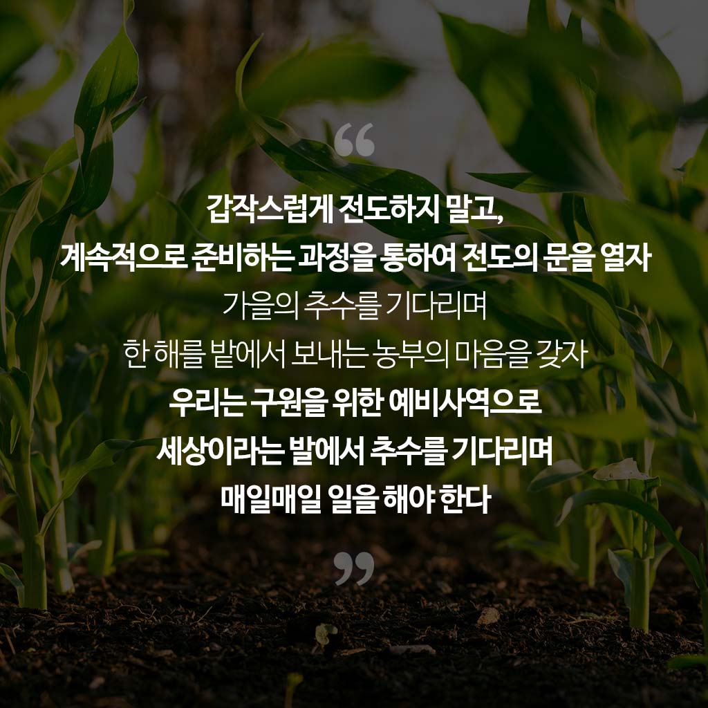 갑작스럽게 전도하지 말고, 계속적으로 준비하는 과정을 통하여 전도의 문을 열자. 가을의 추수를 기다리며 한 해를 밭에서 보내는 농부의 마음을 갖자. 우리는 구원을 위한 예비사역으로 세상이라는 발에서 추수를 기다리며 매일매일 일을 해야 한다.