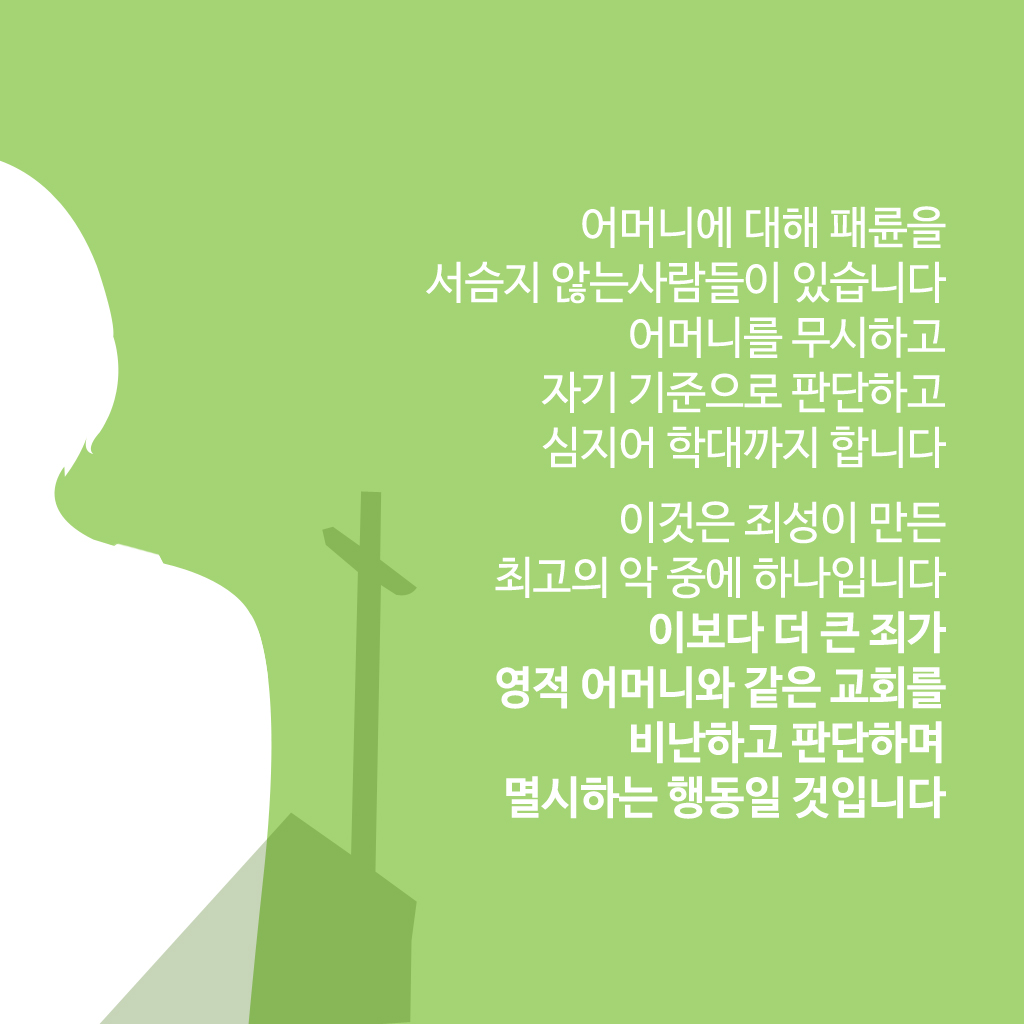 어머니에 대하여 적극적인 효孝가 없는 것이 죄라는 것을 기억하십시오. 당신은 교회를 사랑하며 교회를 위해 축복 어린 기도를 하고 계십니까?