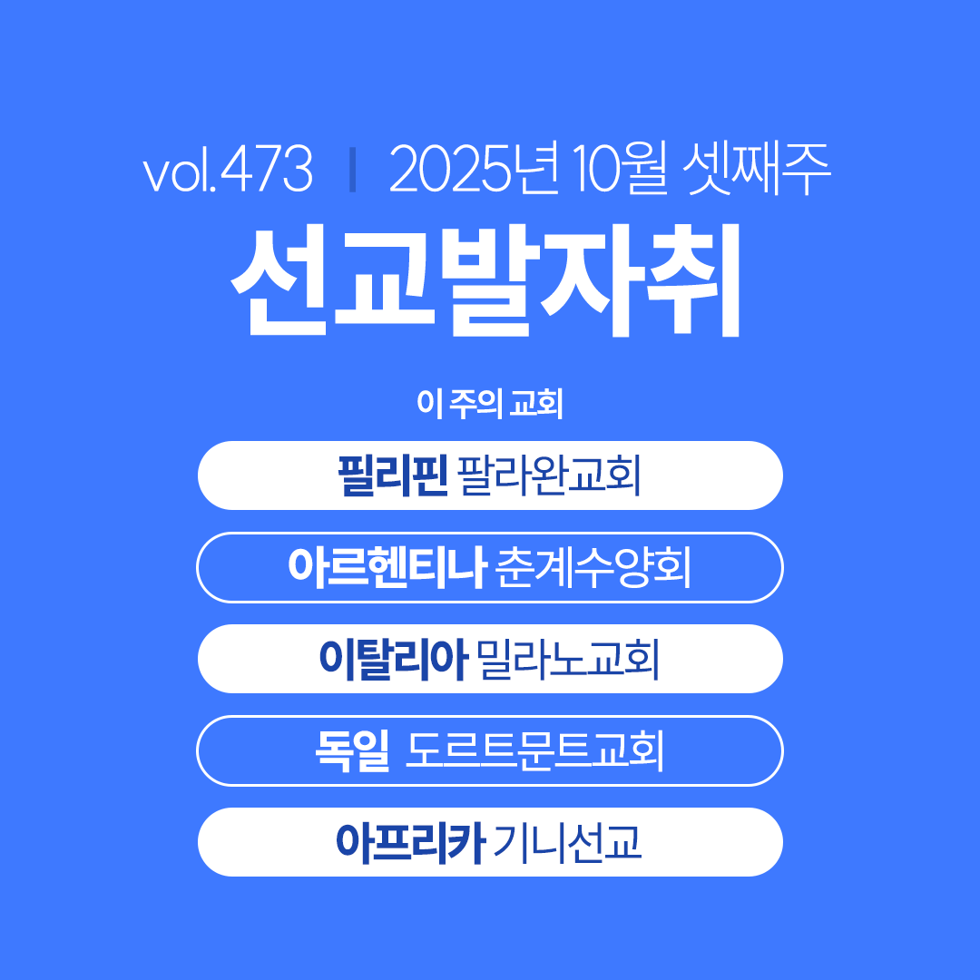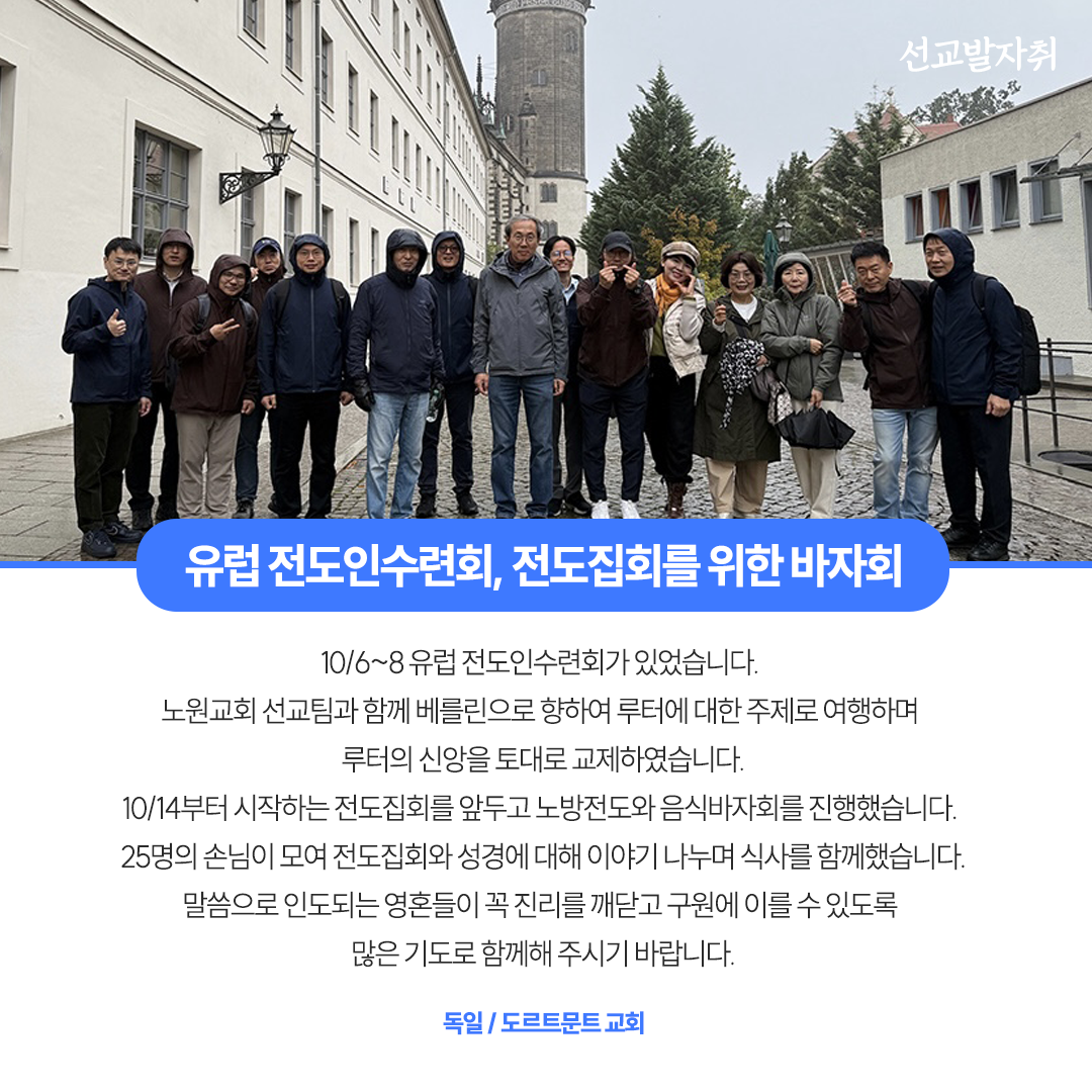 2025년 10월 20일 팔라완교회/ 춘계수양회/ 밀라노교회/ 도르트문트교회/ 기니선교