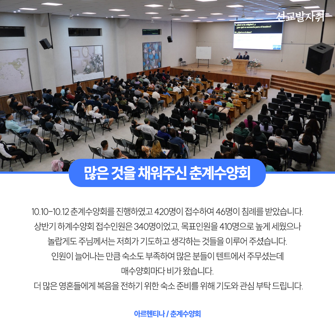 10.10-10.12 춘계수양회를 진행하였고 420명이 접수하여 46명이 침례를 받았습니다.