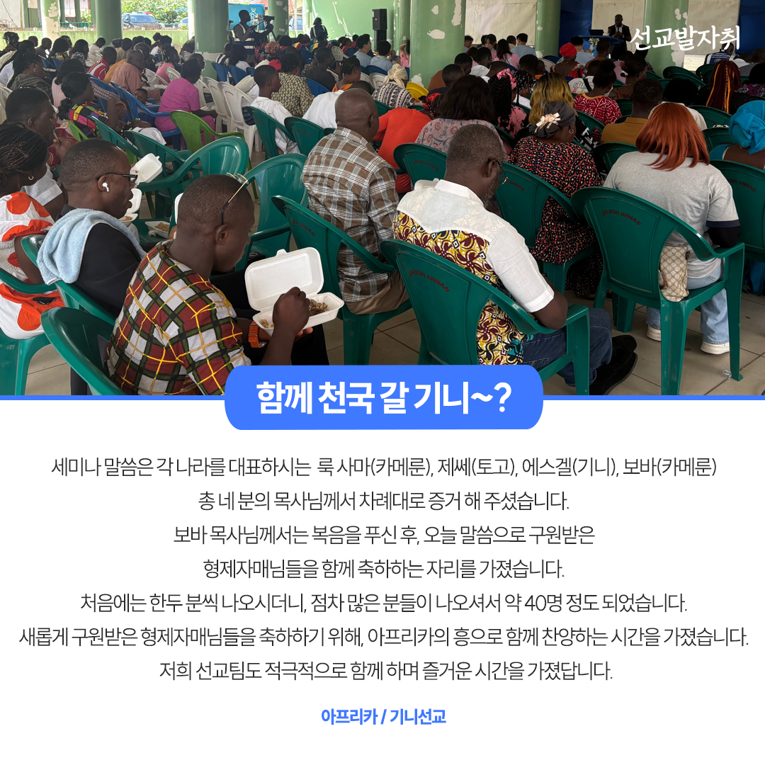 세미나 말씀은 각 나라를 대표하시는 룩 사마(카메룬), 제쎄(토고), 에스겔(기니), 보바(카메룬) 총 네 분의 목사님께서 차례대로 증거 해 주셨습니다. 보바 목사님께서는 복음을 푸신 후, 오늘 말씀으로 구원받은 형제자매님들을 함께 축하하는 자리를 가졌습니다.