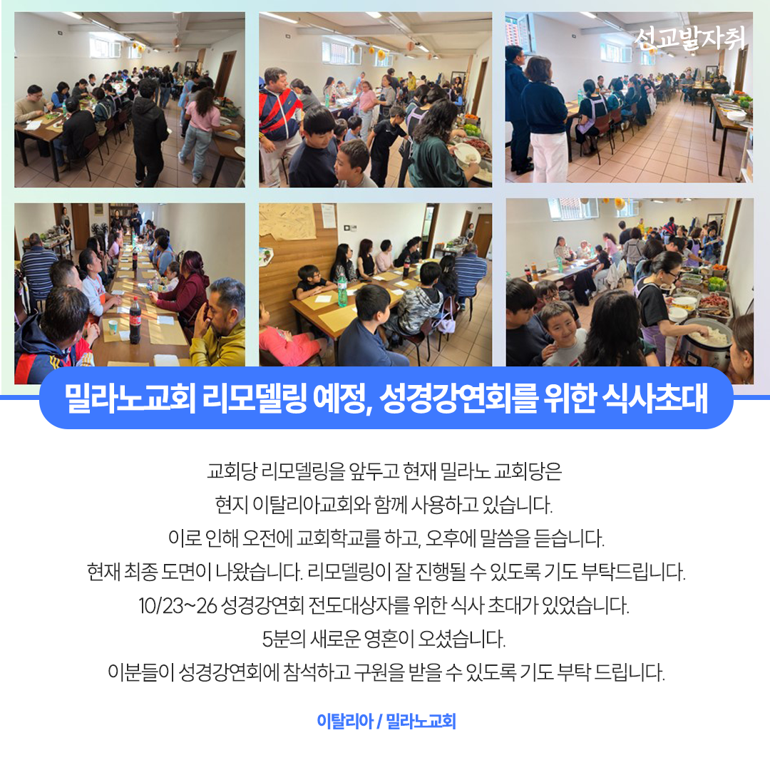 밀라노교회 리모델링 예정, 성경강연회를 위한 식사초대