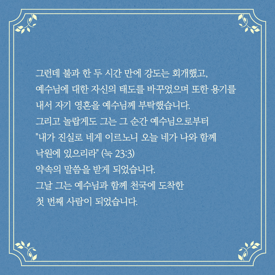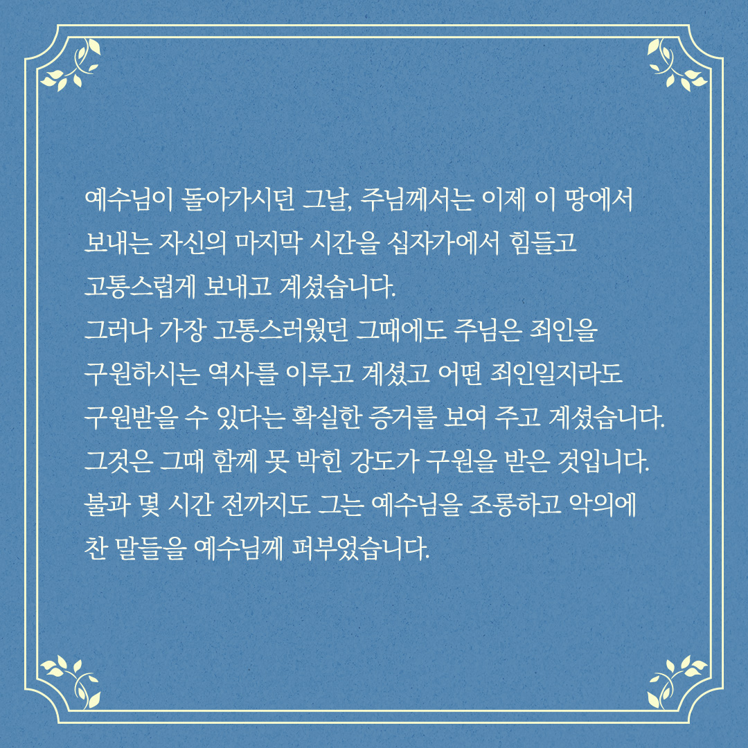 "내가 진실로 네게 이르노니 오늘 네가 나와 함께 낙원에 있으리라"(눅 23:3)는 약속의 말씀을 받게 되었습니다.