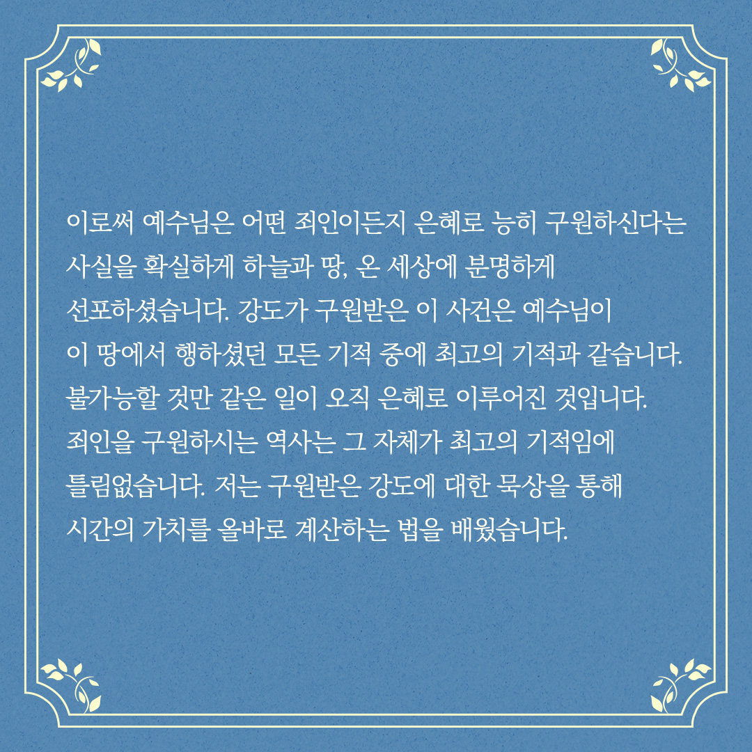 저는 구원받은 강도에 대한 묵상을 통해 시간의 가치를 올바로 계산하는 법을 배웠습니다.