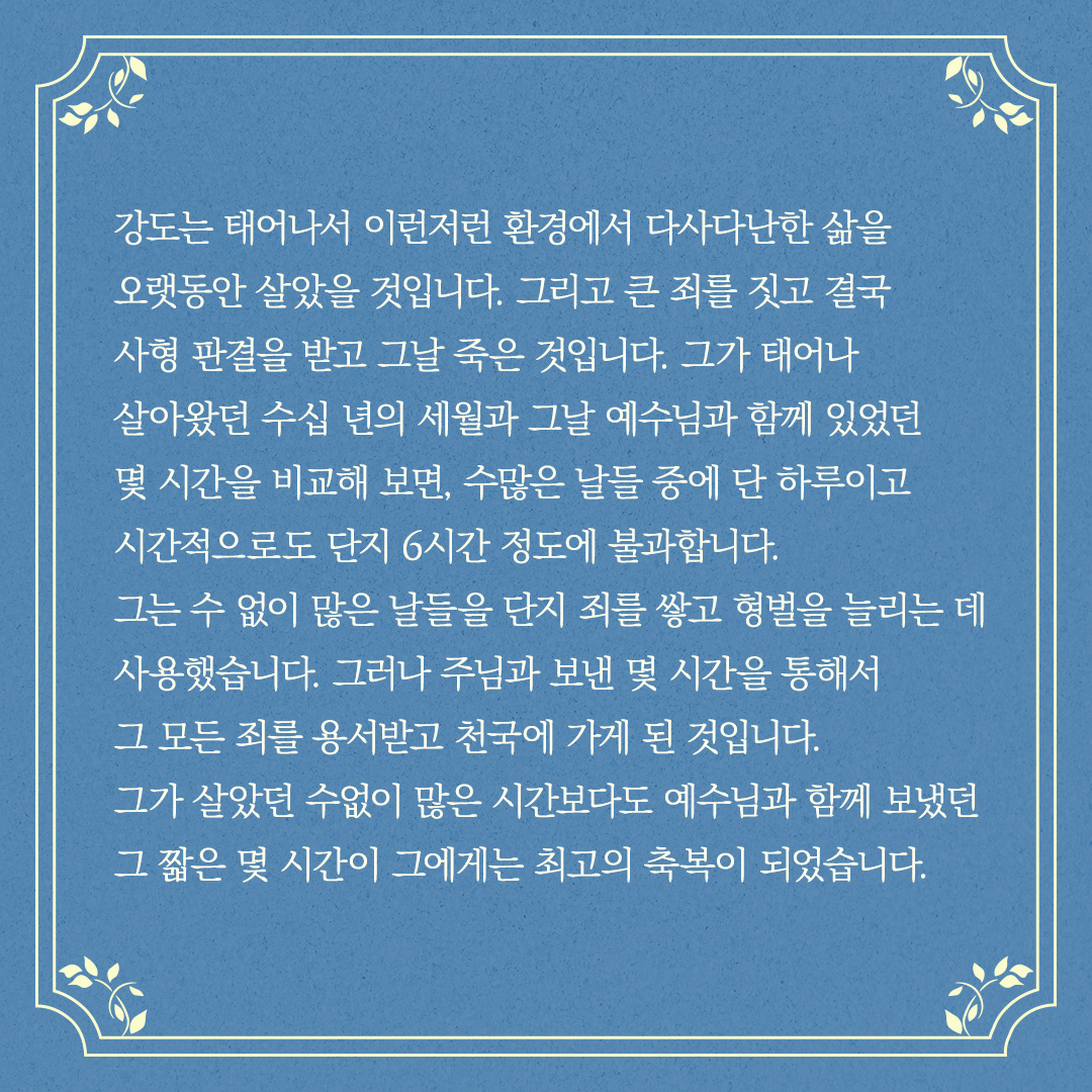 그는 수없이 많은 날들을 단지 죄를 쌓고 형벌을 늘리는 데 사용했습니다. 그러나 주님과 보낸 몇 시간을 통해서 그 모든 죄를 용서받고 천국에 가게 된 것입니다.