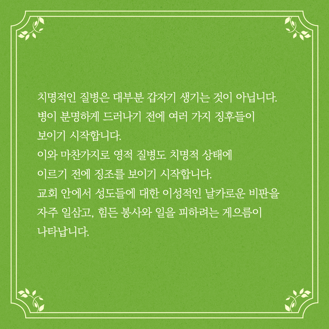 이와 마찬가지로 영적 질병도 치명적 상태에 이르기 전에 징조를 보이기 시작합니다.