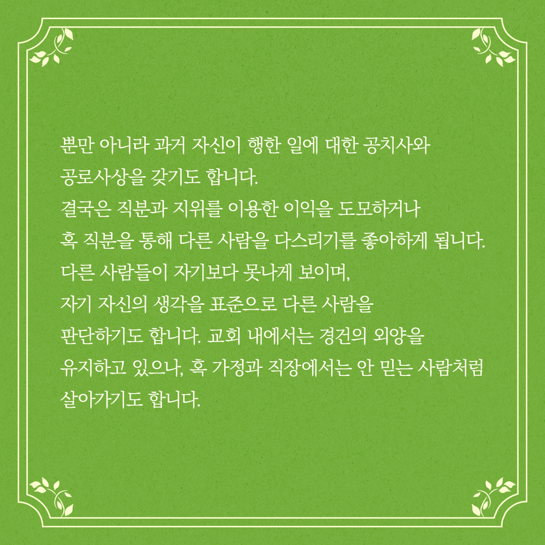 결국은 직분과 지위를 이용한 이익을 도모하거나 혹 직분을 통해 다른 사람을 다스리기를 좋아하게 됩니다.