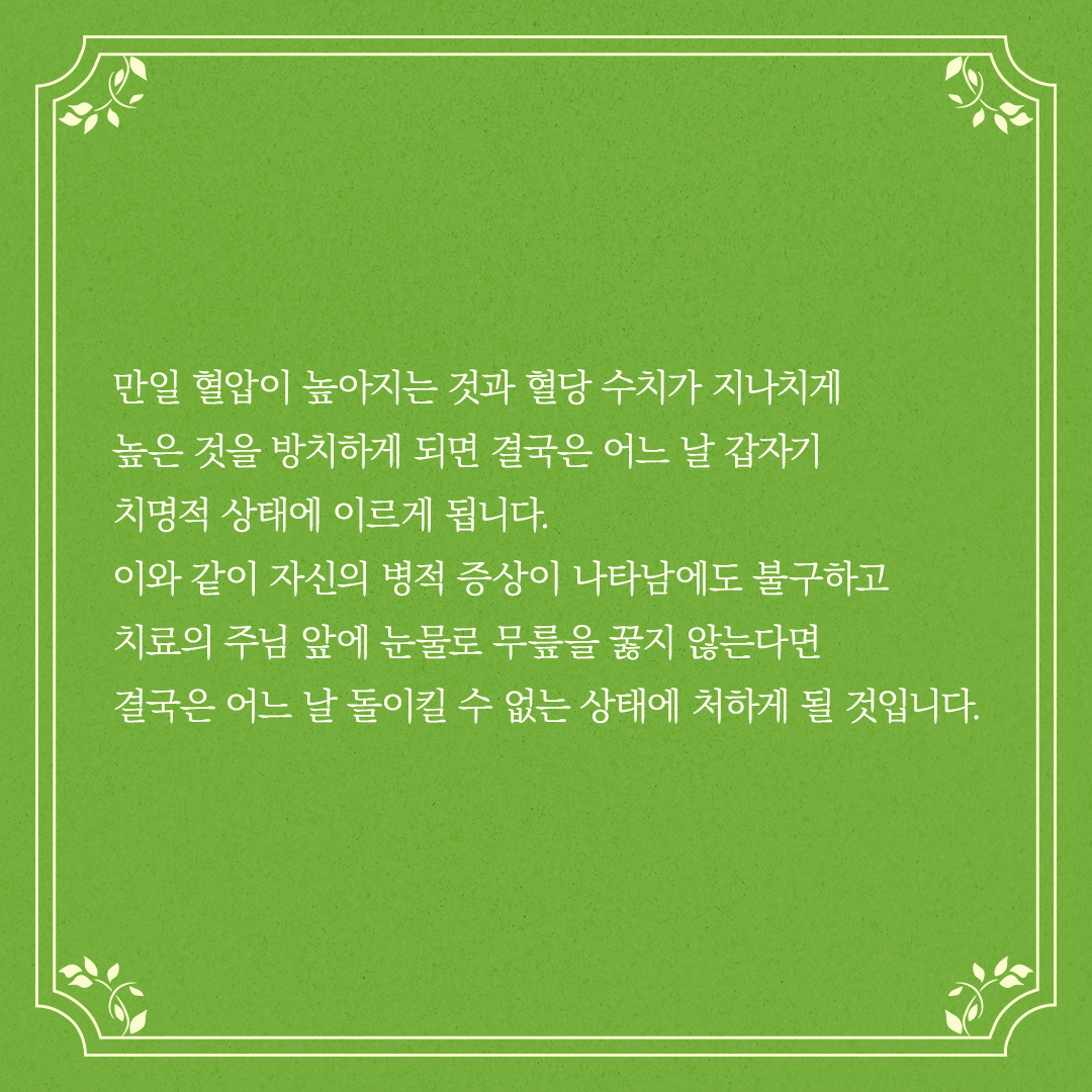 만일 혈압이 높아지는 것과 혈당 수치가 지나치게 높은 것을 방치하게 되면