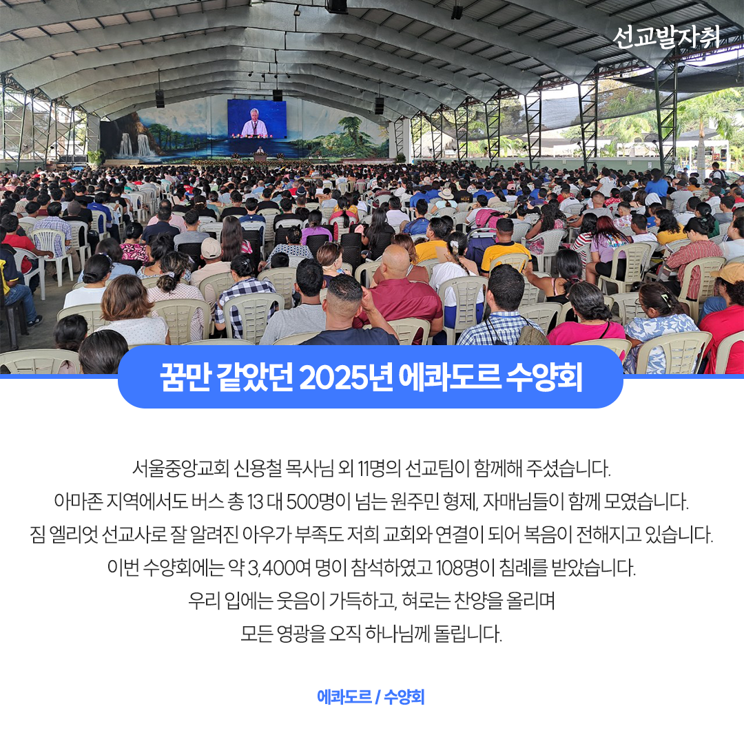 이번 수양회에는 약 3,400여 명이 참석하였고 108명이 침례를 받았습니다.