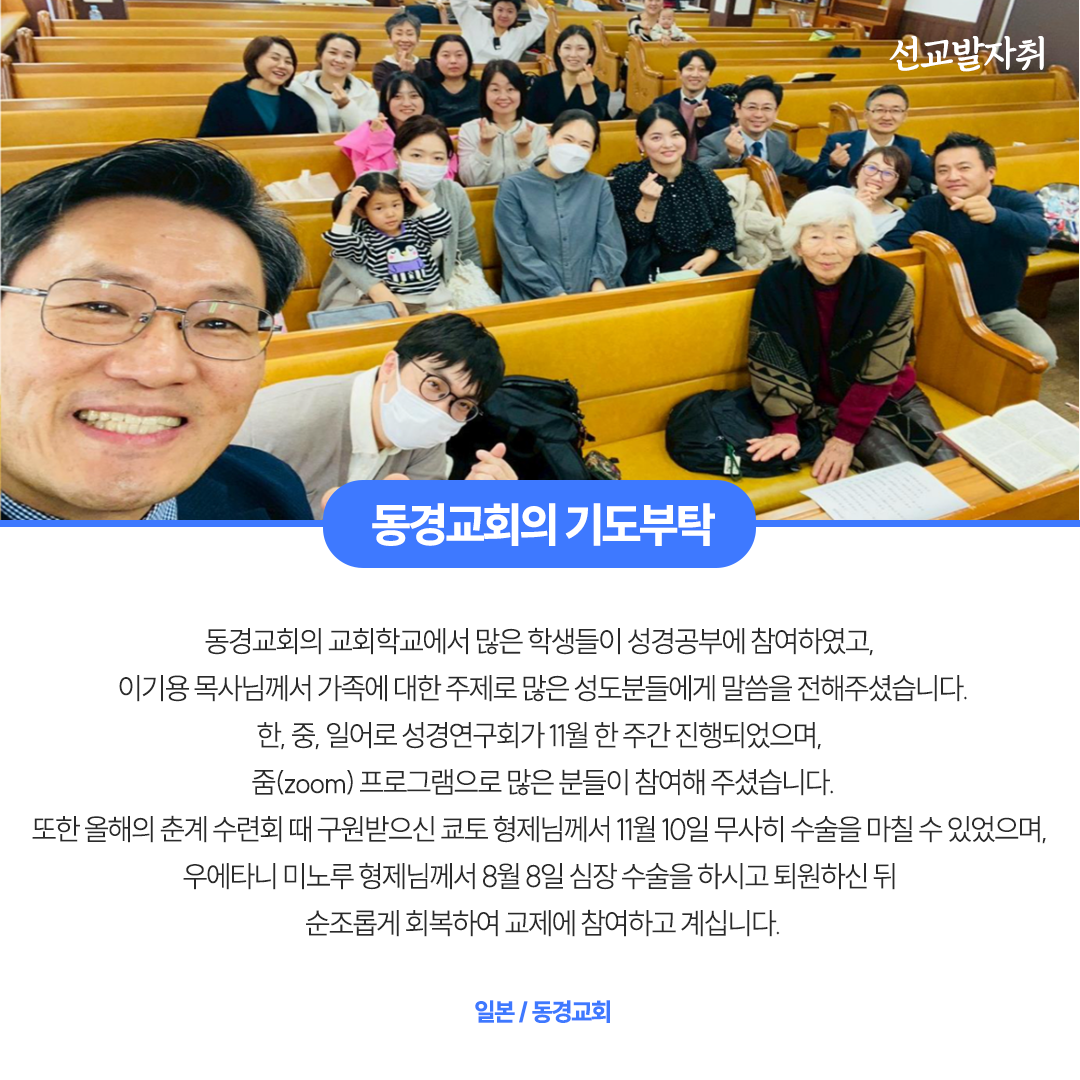 또한 올해의 춘계 수련회 때 구원받으신 쿄토 형제님께서 11월 10일 무사히 수술을 마칠 수 있었으며, 우에타니 미노루 형제님께서 8월 8일 심장 수술을 하시고 퇴원하신 뒤 순조롭게 회복하여 교제에 참여하고 계십니다