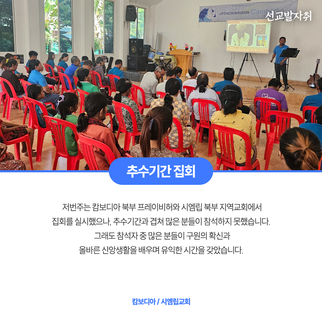 저번주는 캄보디아 북부 프레이비허와 시엠립 북부 지역교회에서 집회를 실시했으나, 추수기간과 겹쳐 많은 분들이 참석하지 못했습니다. 그래도 참석자 중 많은 분들이 구원의 확신과 올바른 신앙생활을 배우며 유익한 시간을 갖았습니다.