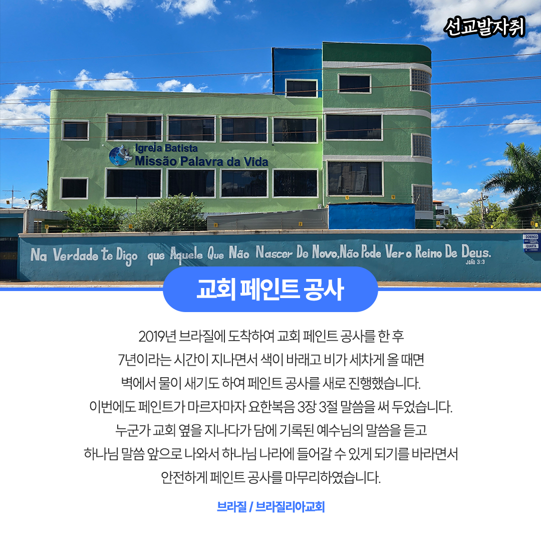2019년 브라질에 도착하여 교회 페인트 공사를 한 후 7년이라는 시간이 지나면서 색이 바래고 비가 세차게 올 때면 벽에서 물이 새기도 하여 페인트 공사를 새로 진행했습니다. 이번에도 페인트가 마르자마자 요한복음 3장 3절 말씀을 써 두었습니다.