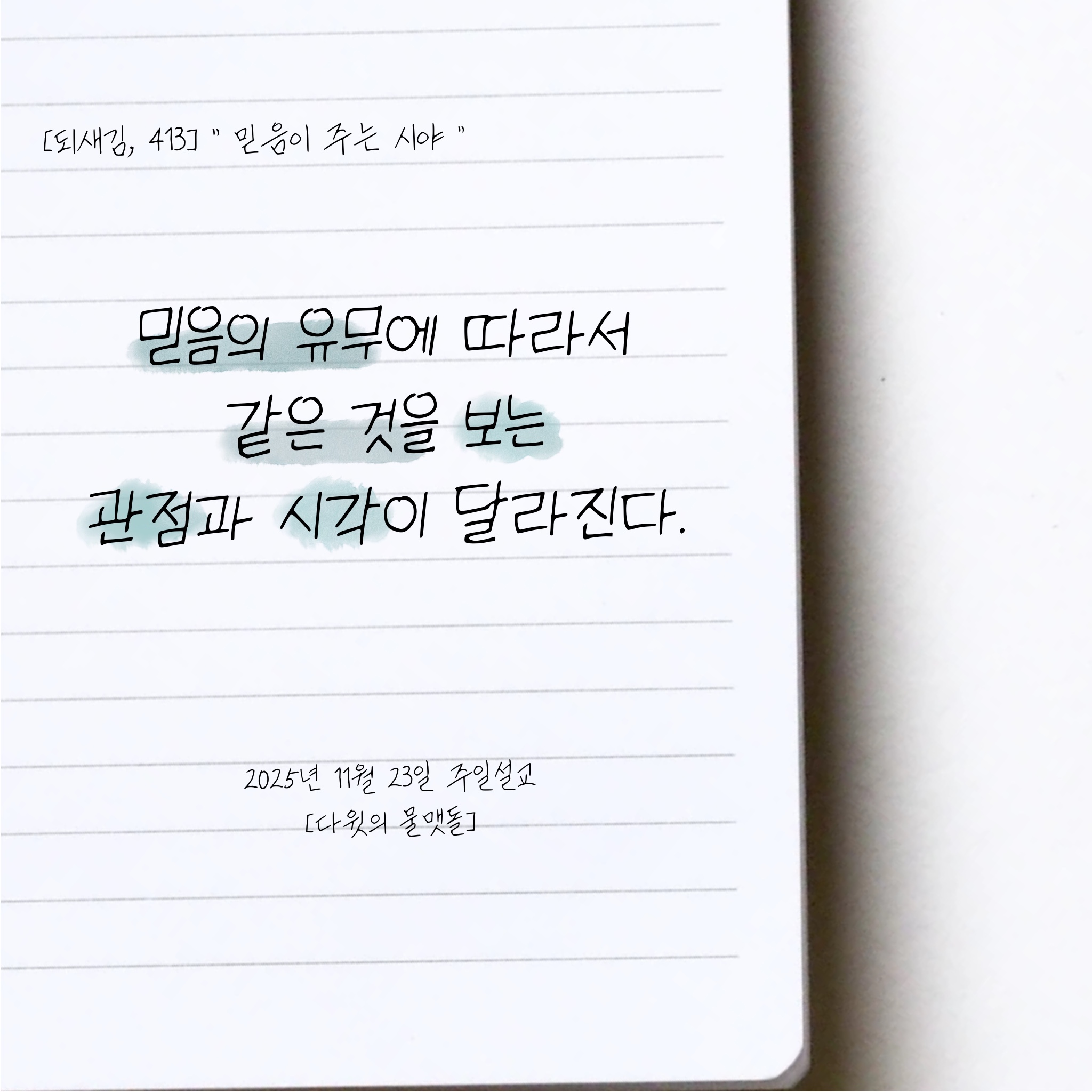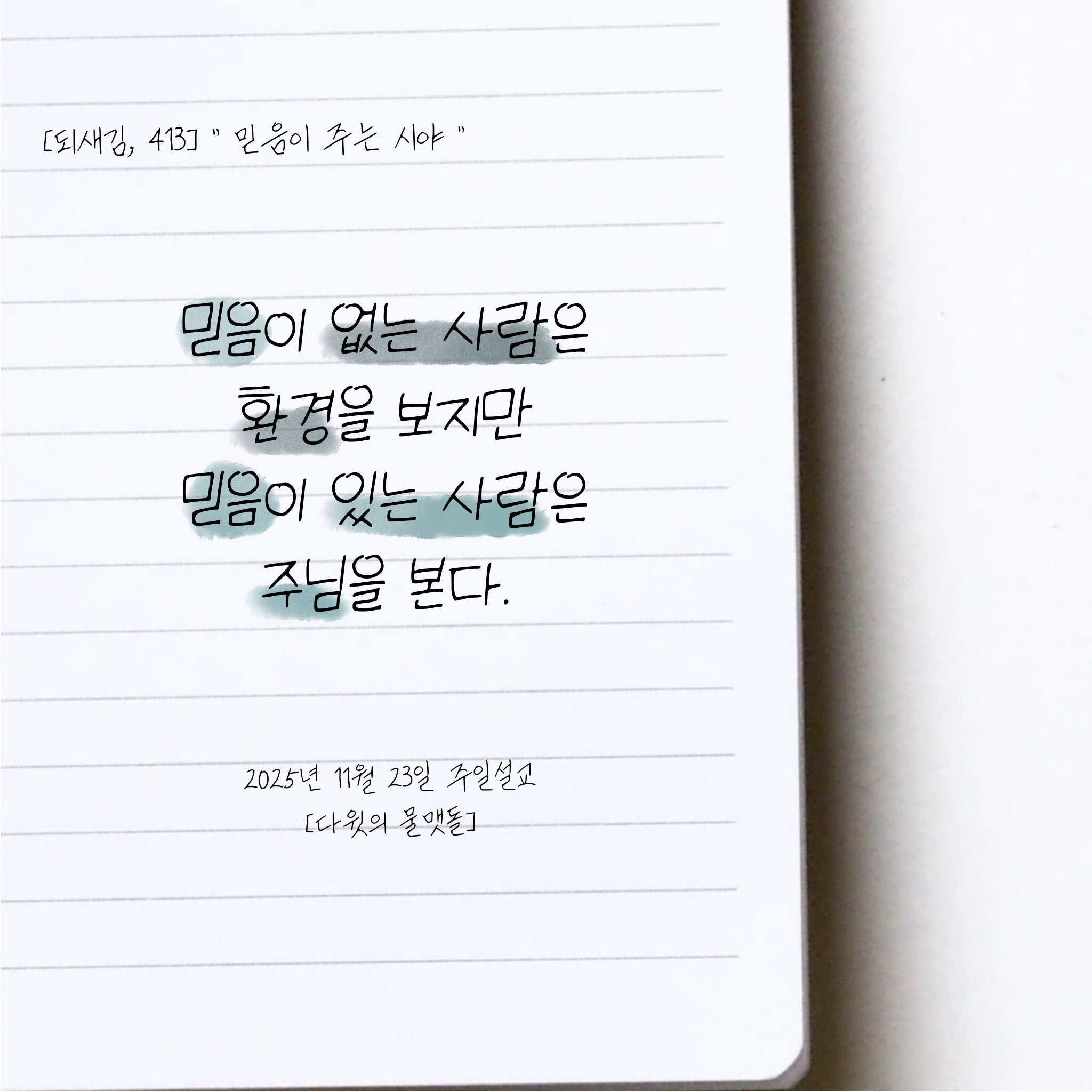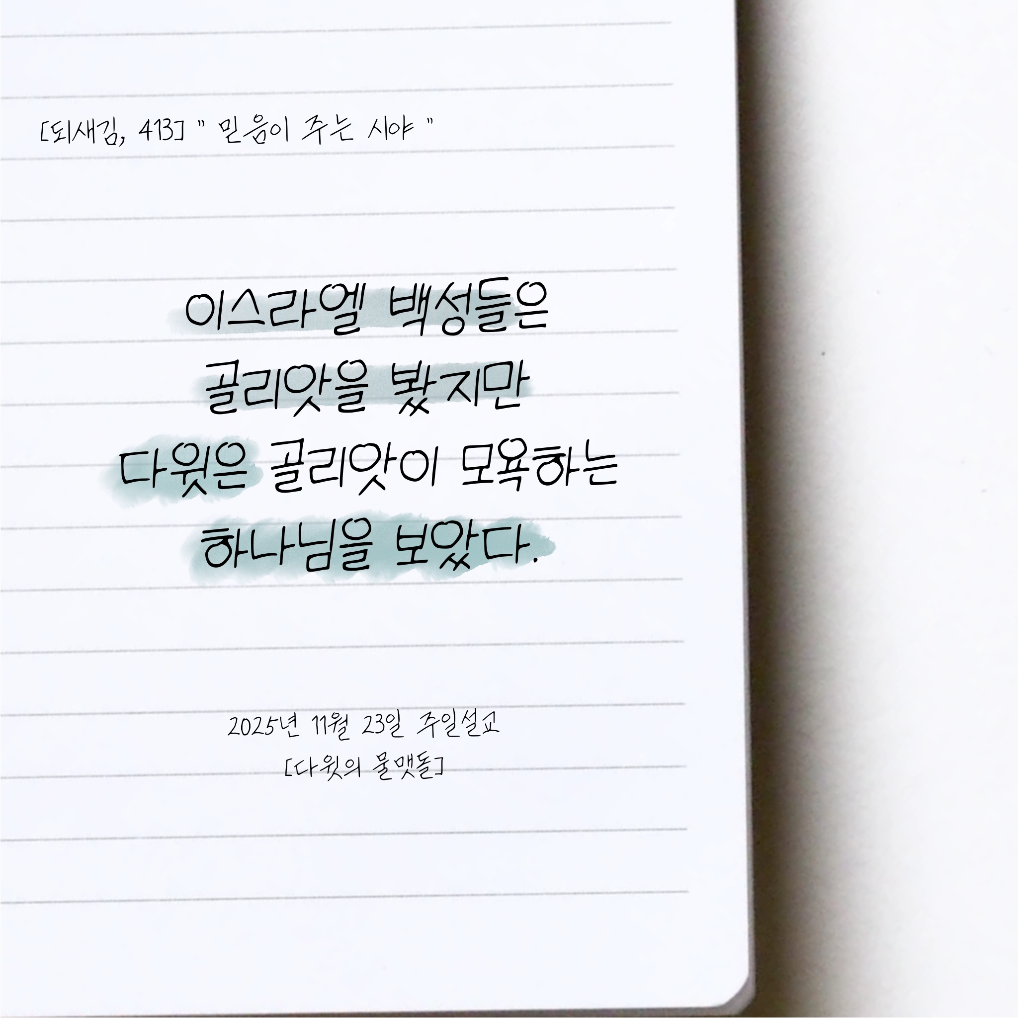 이스라엘 백성들은 블레셋의 거인 골리앗 앞에 벌벌 떨고 있는데, 다윗은 ‘이 할례 없는 블레셋 사람이 누구관대 사시는 하나님의 군대를 모욕하겠느냐’ 사시는 하나님. 그러니까 “저게 겁도 없이” 그 말이에요. “저것이 겁도 없이 하나님을 모독하네. 살아계신 하나님의 군대를 모독하네.” 그러니까 보는 관점이 다릅니다. 그러니까 신앙이라는 것은 상황을 보는 것이 아니라 상황 배후의 하나님을 보는 것이 믿음인 거예요, 믿음. 그래서 믿음이 작으면 이제 현 상황 때문에 어찌할지 모르잖아요. 지금도 우리 삶 가운데서도 우리가 아주 쩔쩔매고, 아주 어려운 환경적인 상황이 있습니다. 골리앗이 보이는 거예요.