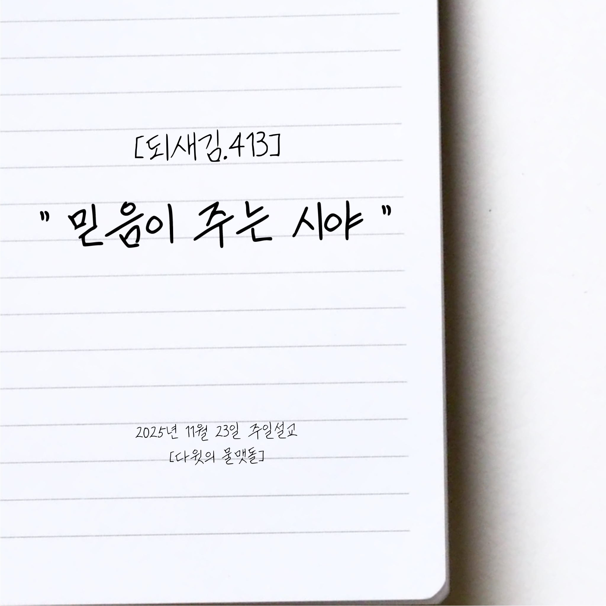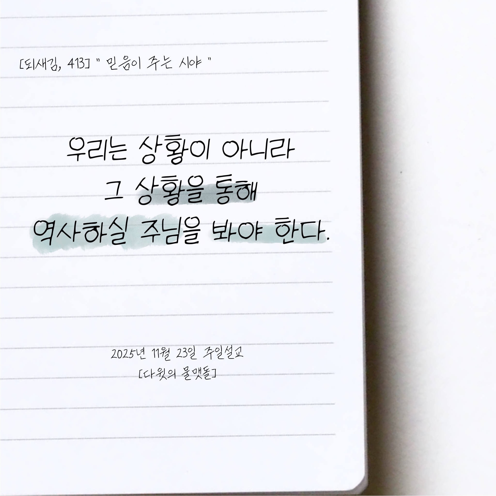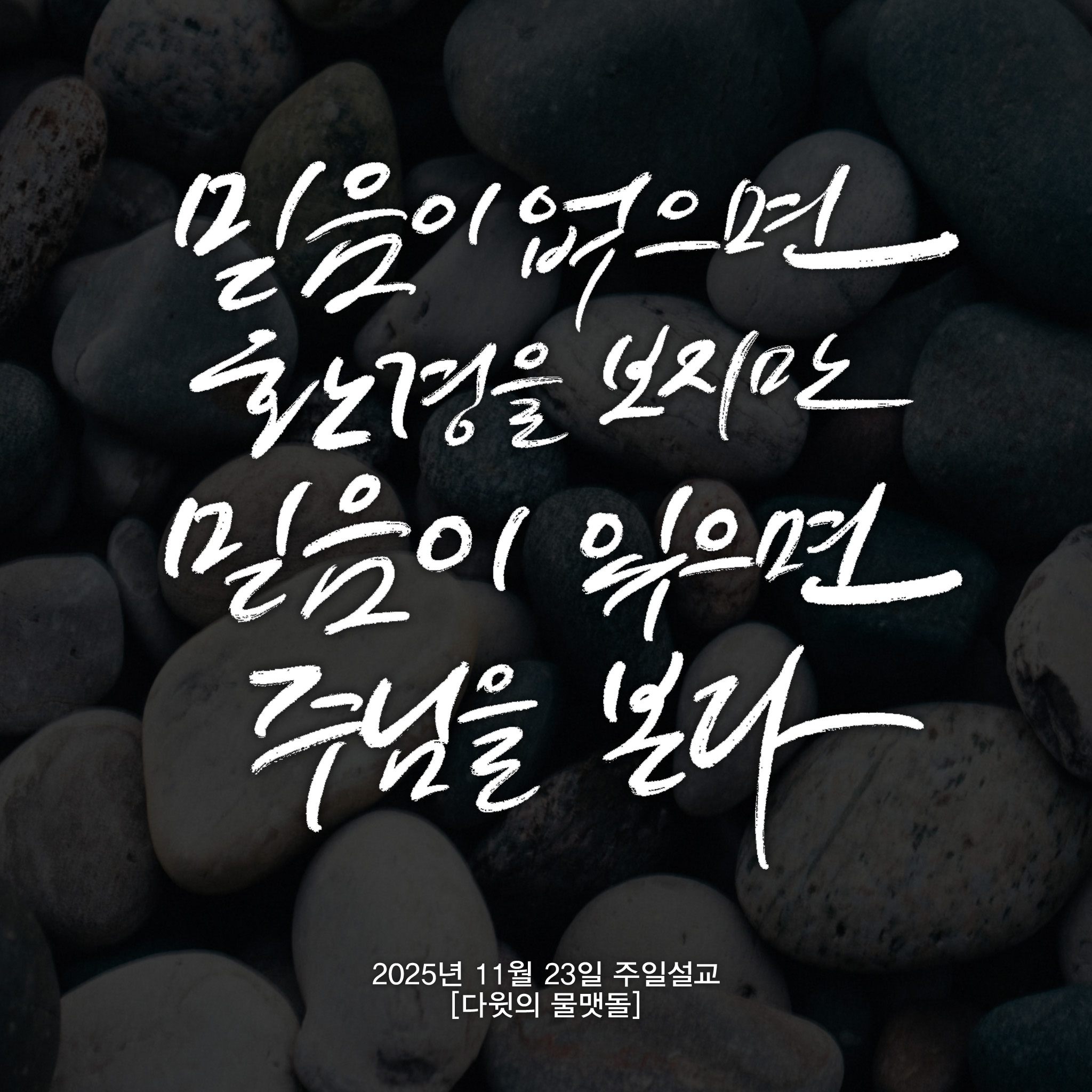이스라엘 백성들은 블레셋의 거인 골리앗 앞에 벌벌 떨고 있는데, 다윗은 ‘이 할례 없는 블레셋 사람이 누구관대 사시는 하나님의 군대를 모욕하겠느냐’ 사시는 하나님. 그러니까 “저게 겁도 없이” 그 말이에요. “저것이 겁도 없이 하나님을 모독하네. 살아계신 하나님의 군대를 모독하네.” 그러니까 보는 관점이 다릅니다. 그러니까 신앙이라는 것은 상황을 보는 것이 아니라 상황 배후의 하나님을 보는 것이 믿음인 거예요, 믿음. 그래서 믿음이 작으면 이제 현 상황 때문에 어찌할지 모르잖아요. 지금도 우리 삶 가운데서도 우리가 아주 쩔쩔매고, 아주 어려운 환경적인 상황이 있습니다. 골리앗이 보이는 거예요.