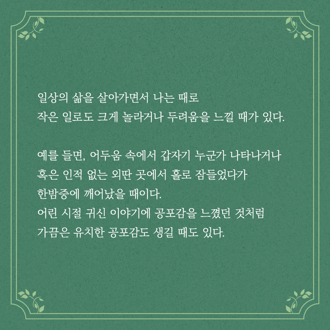 어린 시절 귀신 이야기에 공포감을 느꼈던 것처럼 가끔은 유치한 공포감도 생길 때도 있다.