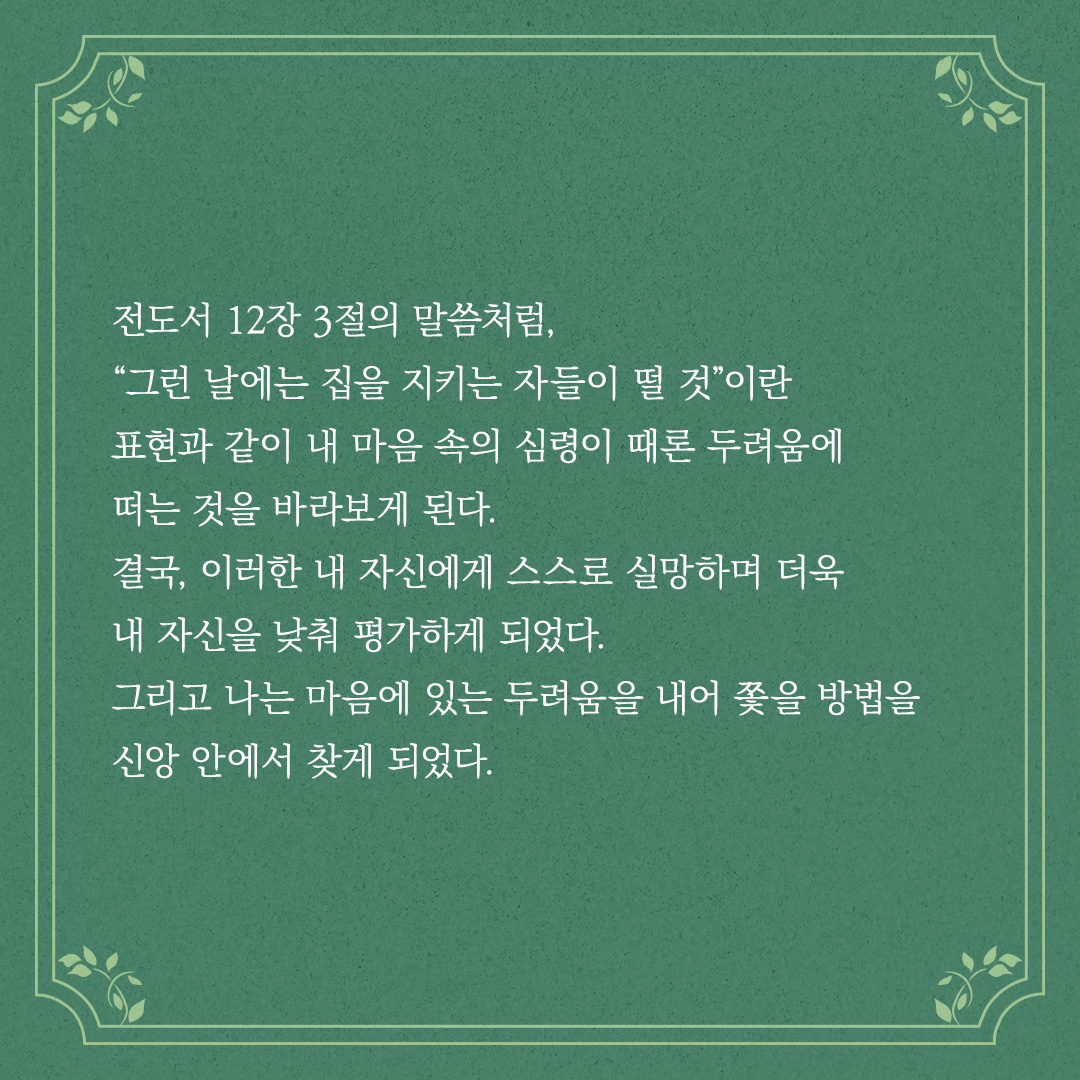 이란 표현과 같이 내 마음 속의 심령이 때론 두려움에 떠는 것을 바라보게 된다.