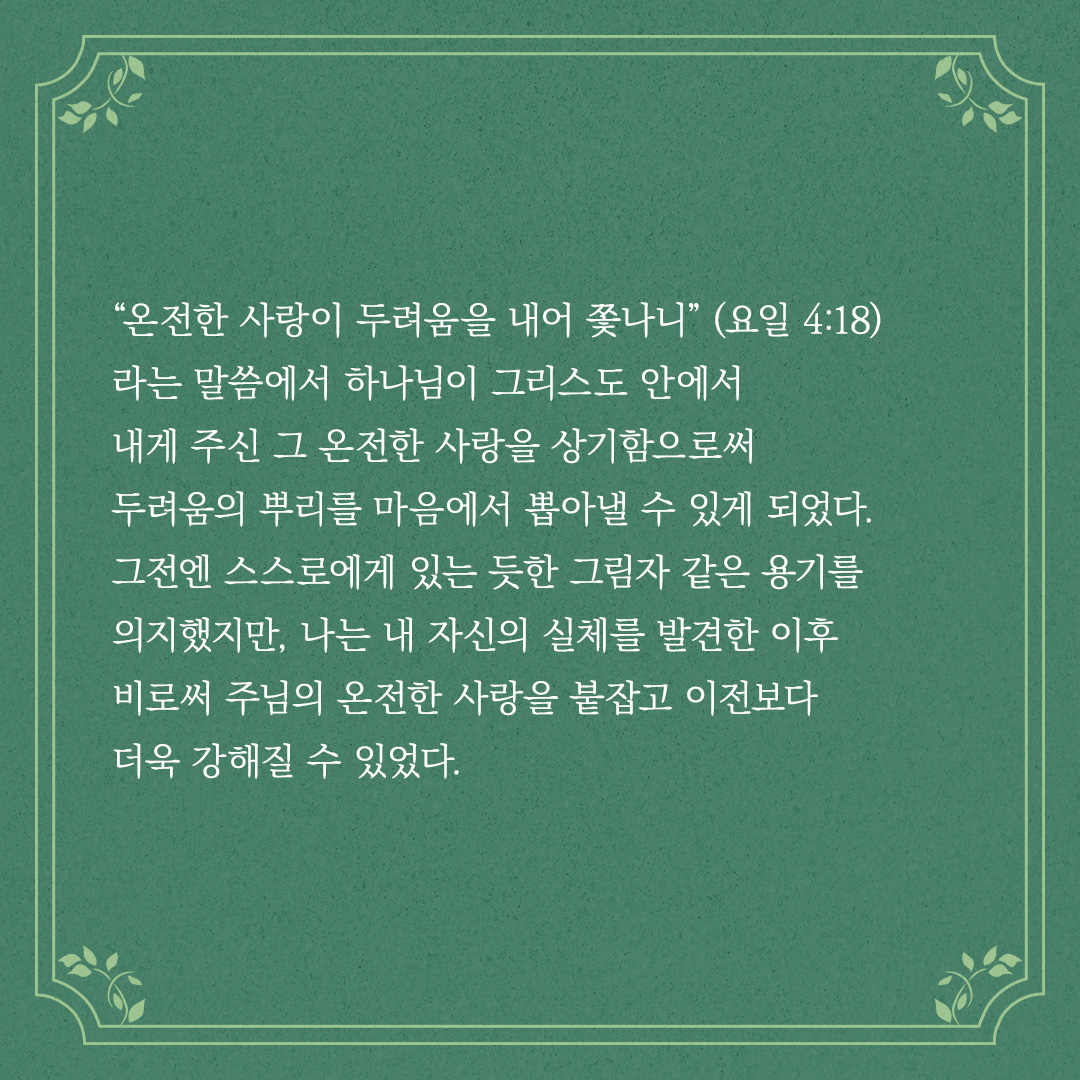 라는 말씀에서 하나님이 그리스도 안에서 내게 주신 그 온전한 사랑을 상기함으로써 두려움의 뿌리를 마음에서 뽑아낼 수 있게 되었다.