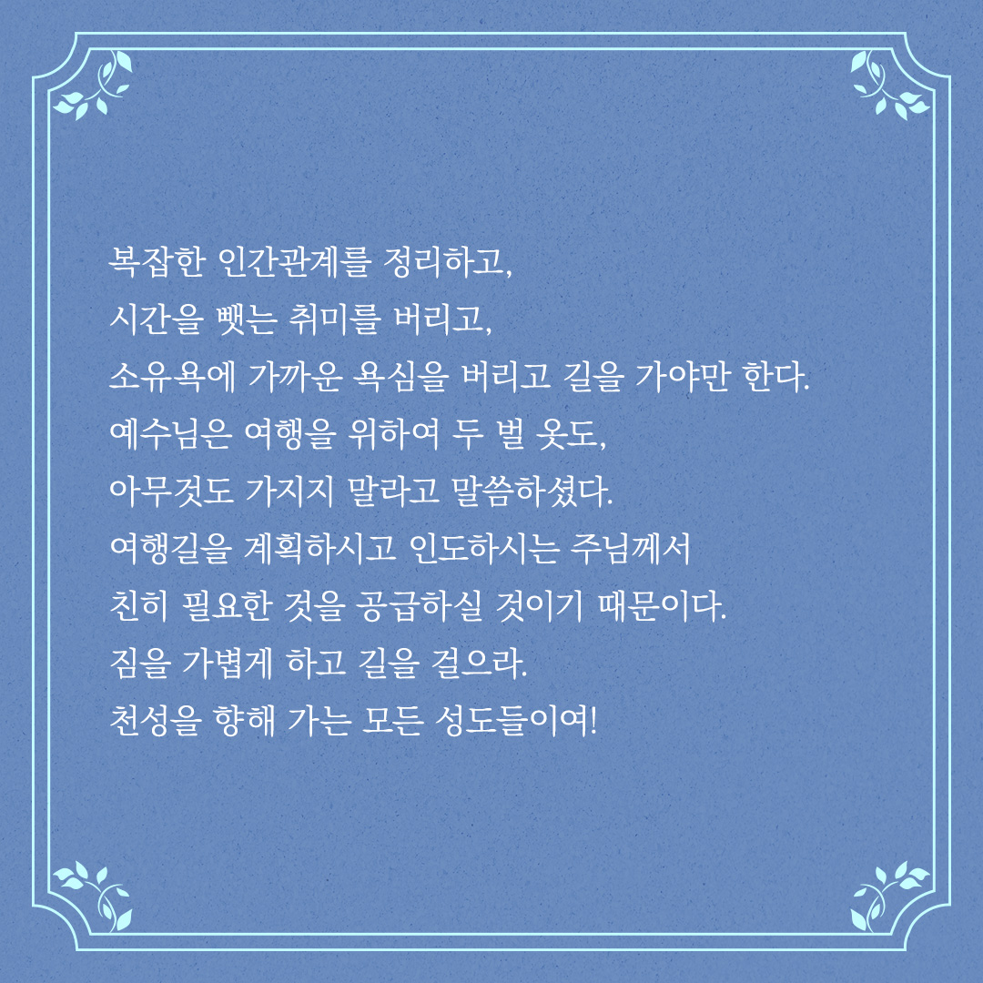 복잡한 인간관계를 정리하고, 시간을 뺏는 취미를 버리고, 소유욕에 가까운 욕심을 버리고 길을 가야만 한다.