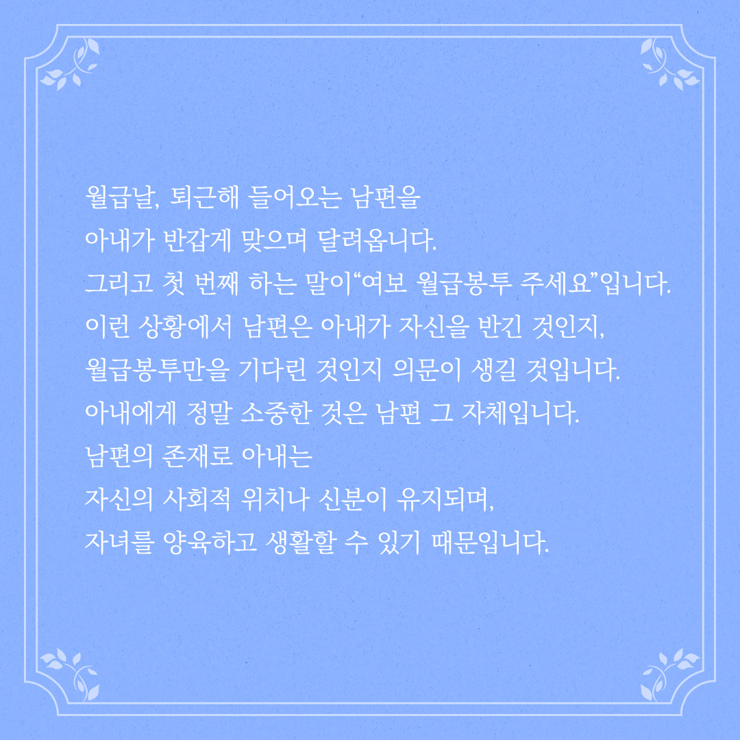 이런 상황에서 남편은 아내가 자신을 반긴 것인지, 월급봉투만을 기다린 것인지 의문이 생길 것입니다.