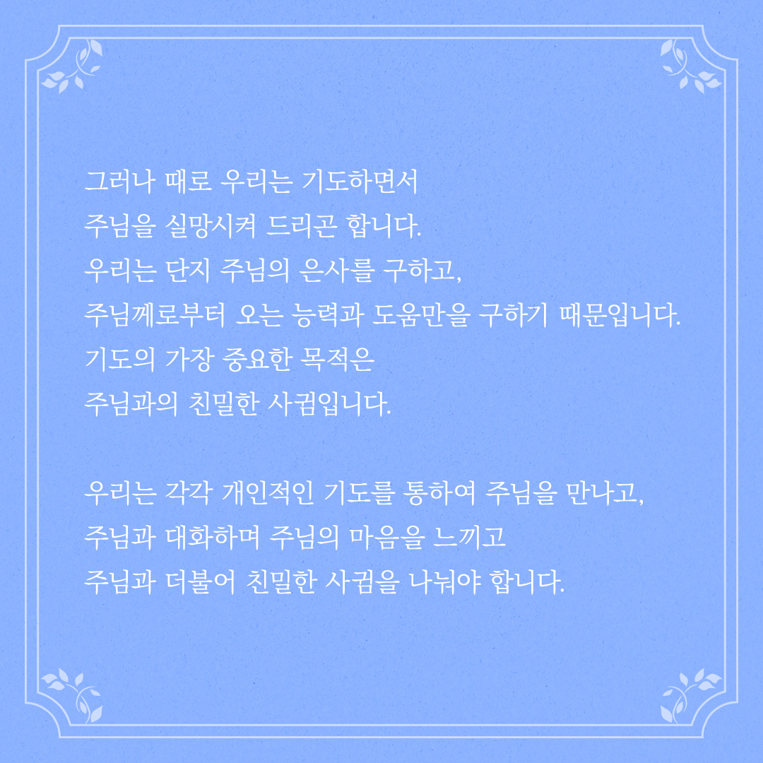 우리는 각각 개인적인 기도를 통하여 주님을 만나고, 주님과 대화하며 주님의 마음을 느끼고 주님과 더불어 친밀한 사귐을 나눠야 합니다.