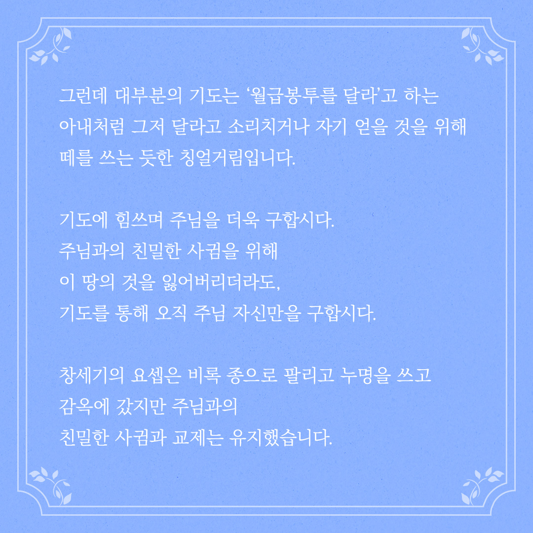 그런데 대부분의 기도는 ‘월급봉투를 달라’고 하는 아내처럼 그저 달라고 소리치거나 자기 얻을 것을 위해 떼를 쓰는 듯한 칭얼거림입니다.