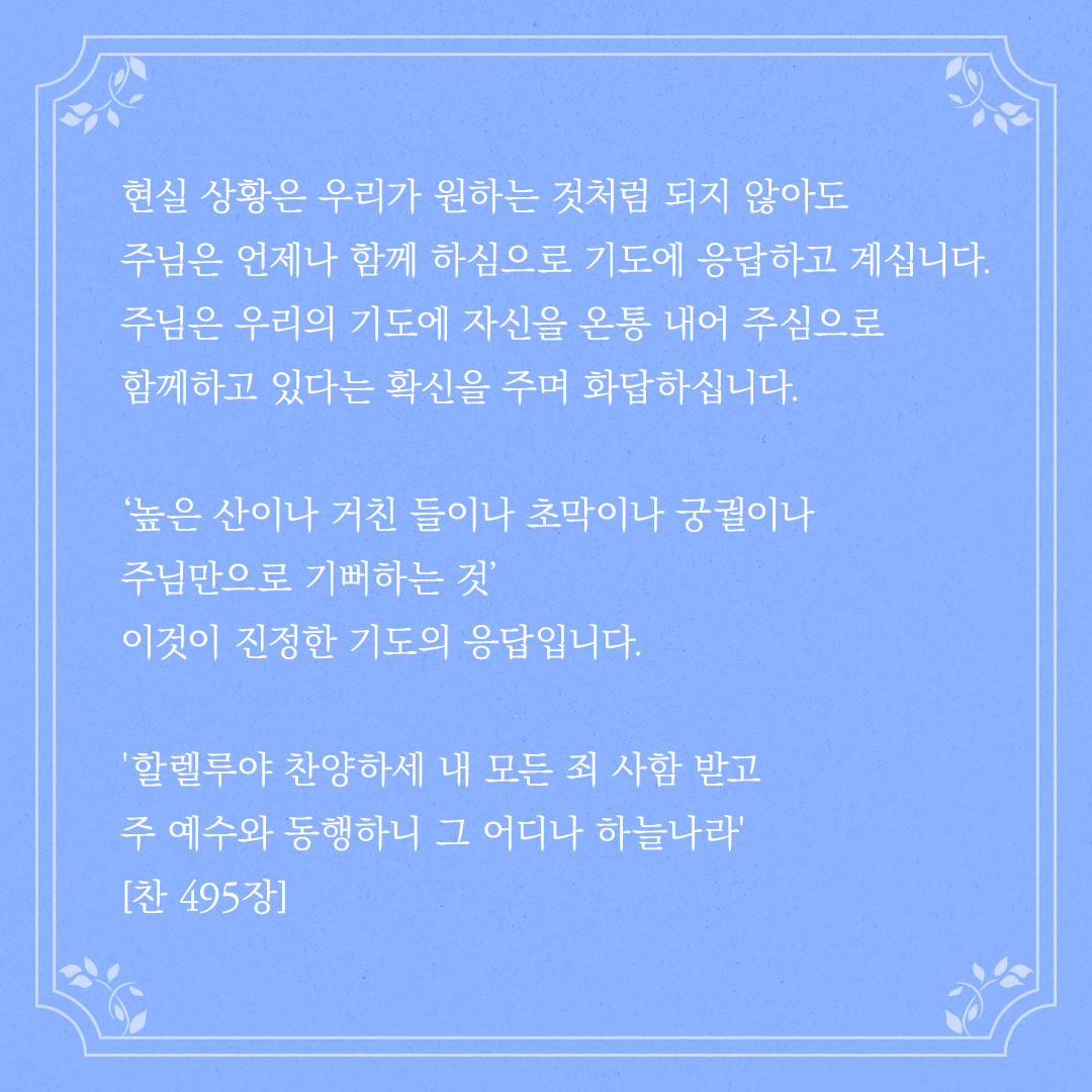 현실 상황은 우리가 원하는 것처럼 되지 않아도 주님은 언제나 함께 하심으로 기도에 응답하고 계십니다.