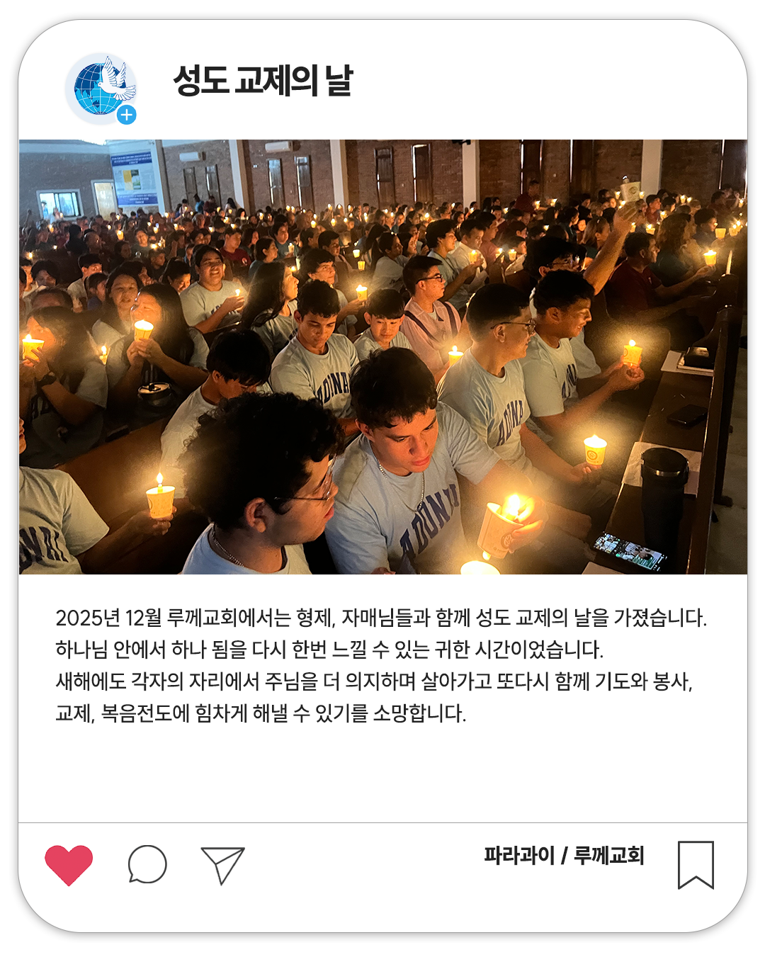 새해에도 각자의 자리에서 주님을 더 의지하며 살아가고 또다시 함께 기도와 봉사, 교제, 복음전도에 힘차게 해낼 수 있기를 소망합니다.