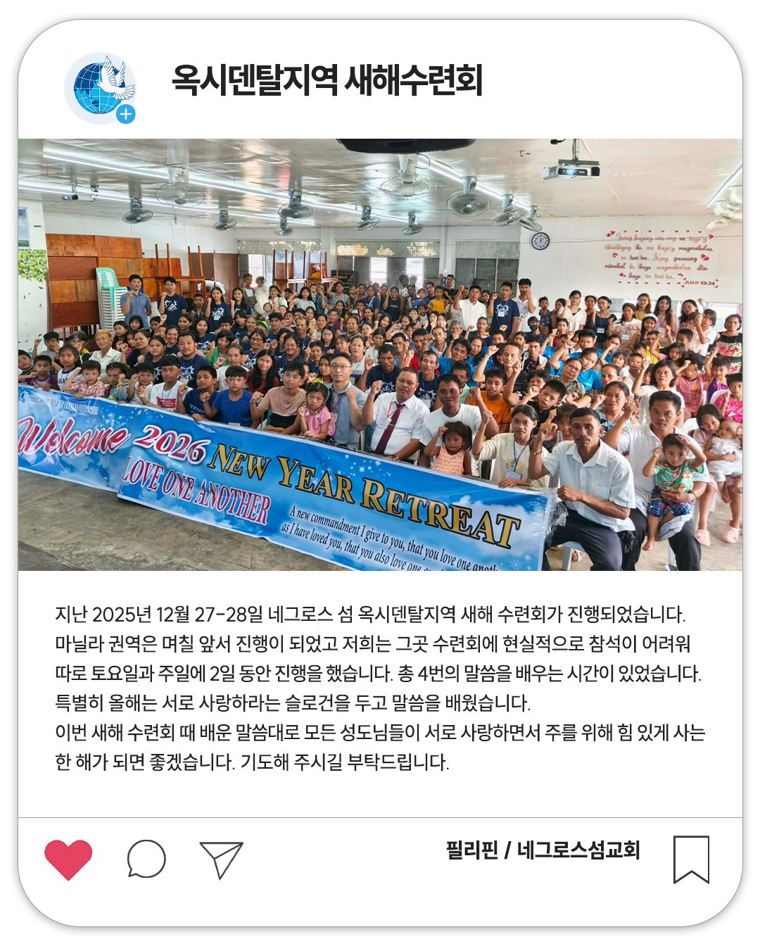 지난 2025년 12월 27-28일 네그로스 섬 옥시덴탈지역 새해 수련회가 진행되었습니다. 마닐라 권역은 며칠 앞서 진행이 되었고 저희는 그곳 수련회에 현실적으로 참석이 어려워 따로 토요일과 주일에 2일 동안 진행을 했습니다.