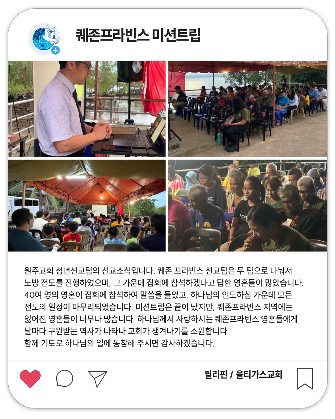 40여 명의 영혼이 집회에 참석하여 말씀을 들었고, 하나님의 인도하심 가운데 모든 전도의 일정이 마무리되었습니다.