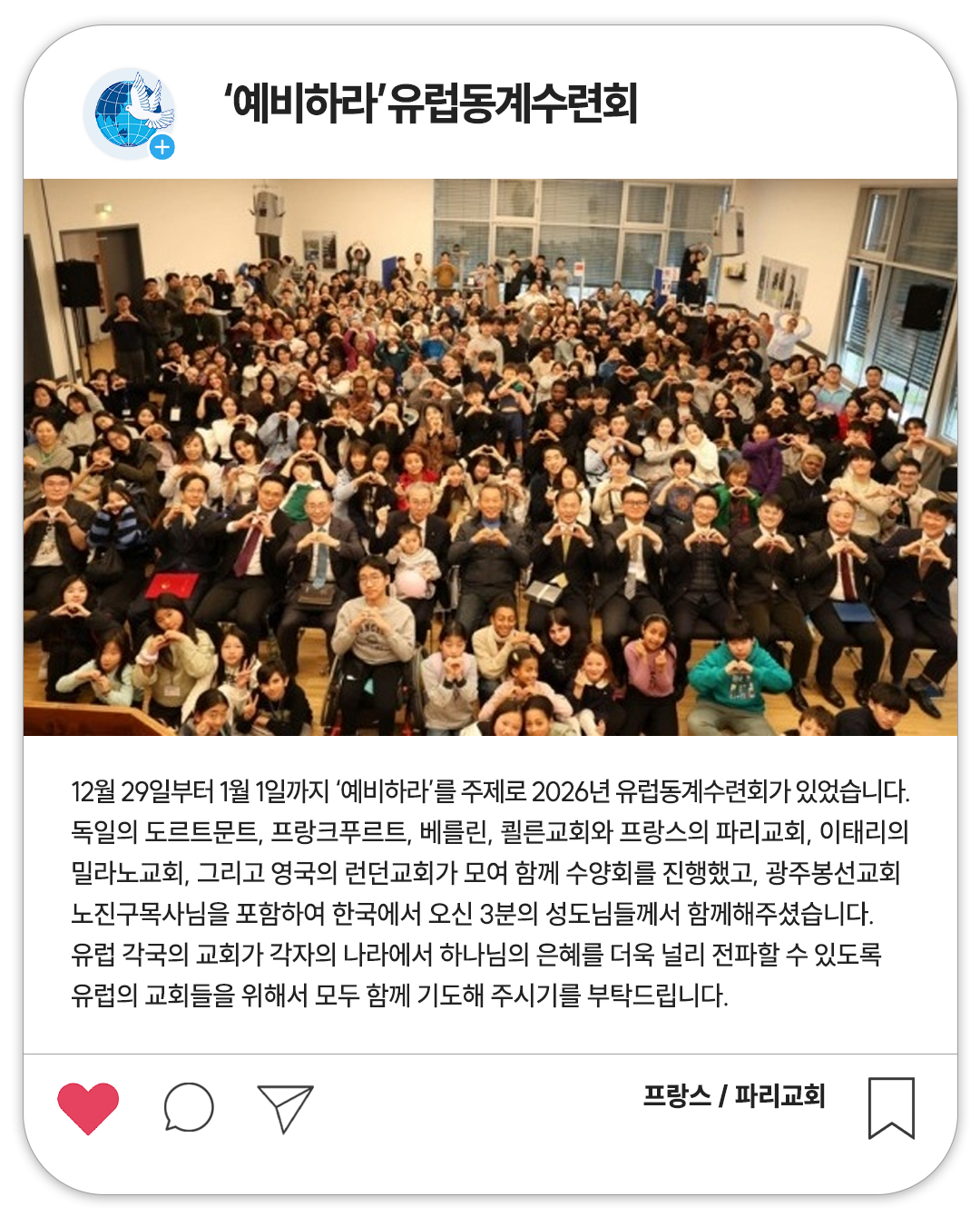 12월 29일부터 1월 1일까지 ‘예비하라’를 주제로 2026년 유럽동계수련회가 있었습니다. 독일의 도르트문트, 프랑크푸르트, 베를린, 쾰른교회와 프랑스의 파리교회, 이태리의 밀라노교회, 그리고 영국의 런던교회가 모여 함께 수양회를 진행했고, 광주봉선교회 노진구목사님을 포함하여 한국에서 오신 3분의 성도님들께서 함께해 주셨습니다.
