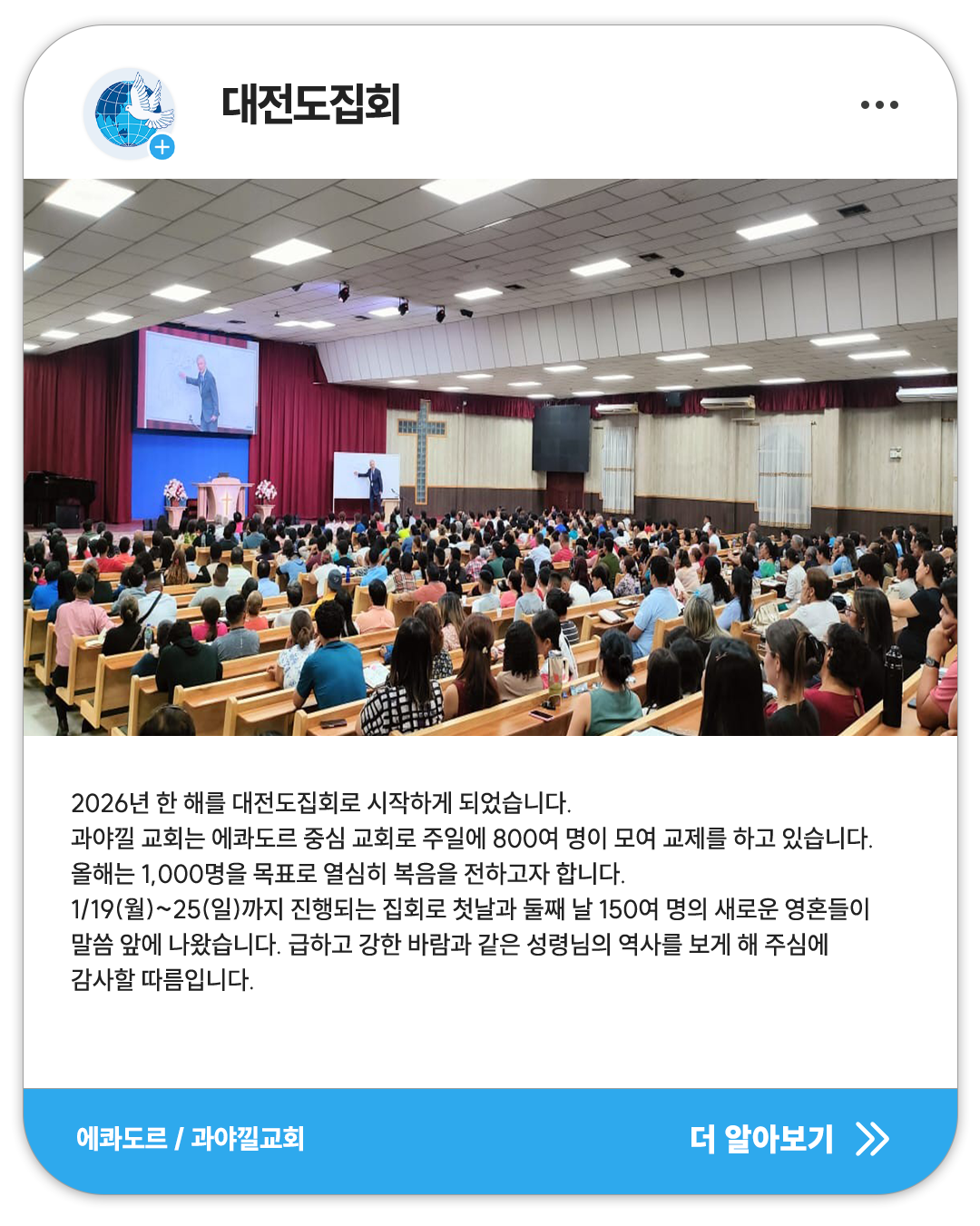 과야낄 교회는 에콰도르 중심 교회로 주일에 800여 명이 모여 교제를 하고 있습니다. 올해는 1,000명을 목표로 열심히 복음을 전하고자 합니다.