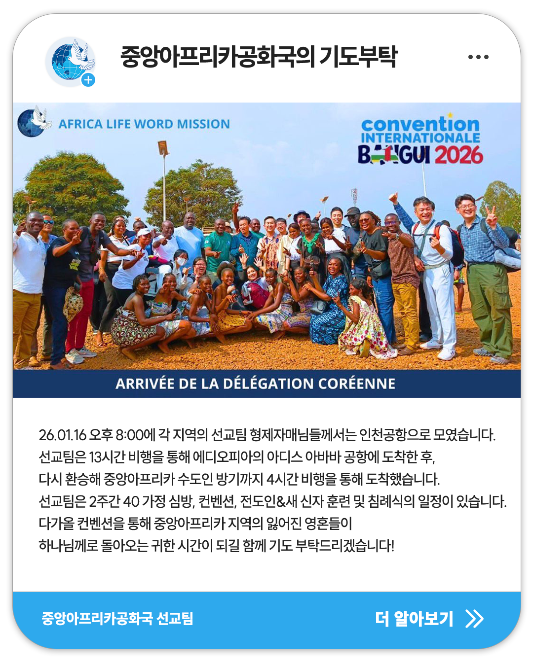 선교팀은 2주간 40 가정 심방, 컨벤션, 전도인&새 신자 훈련 및 침례식의 일정이 있습니다. 다가올 컨벤션을 통해 중앙아프리카 지역의 잃어진 영혼들이 하나님께로 돌아오는 귀한 시간이 되길 함께 기도 부탁드리겠습니다!