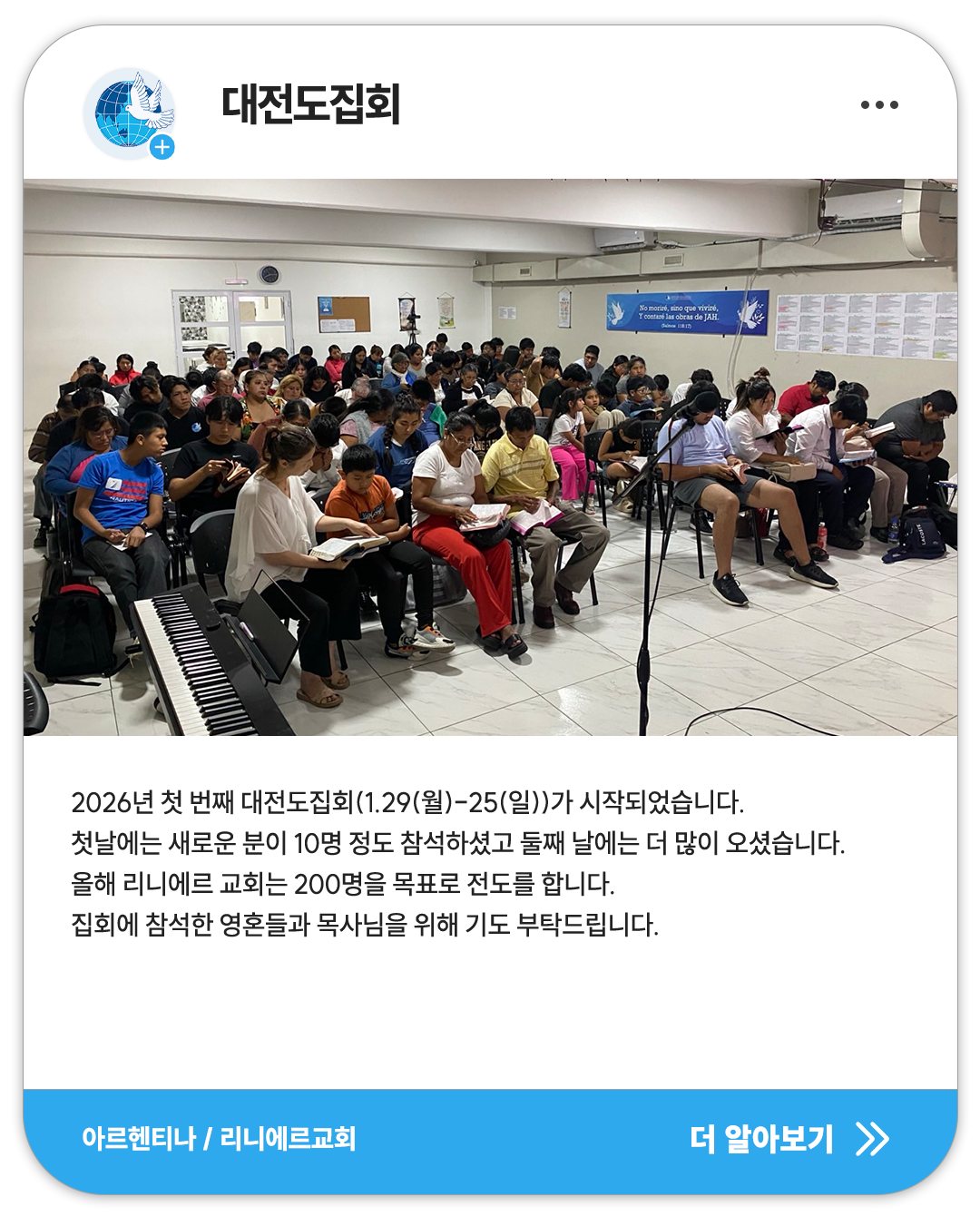 2026년 첫 번째 대전도집회(1.29(월)-25(일))가 시작되었습니다. 첫날에는 새로운 분이 10명 정도 참석하셨고 둘째 날에는 더 많이 오셨습니다.