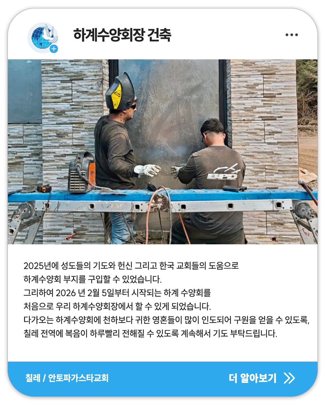 2025년에 성도들의 기도와 헌신 그리고 한국 교회들의 도움으로 하계수양회 부지를 구입할 수 있었습니다. 그리하여 2026 년 2월 5일부터 시작되는 하계 수양회를 처음으로 우리 하계수양회장에서 할 수 있게 되었습니다. 다가오는 하계수양회에 천하보다 귀한 영혼들이 많이 인도되어 구원을 얻을 수 있도록, 칠레 전역에 복음이 하루빨리 전해질 수 있도록 계속해서 기도 부탁드립니다.