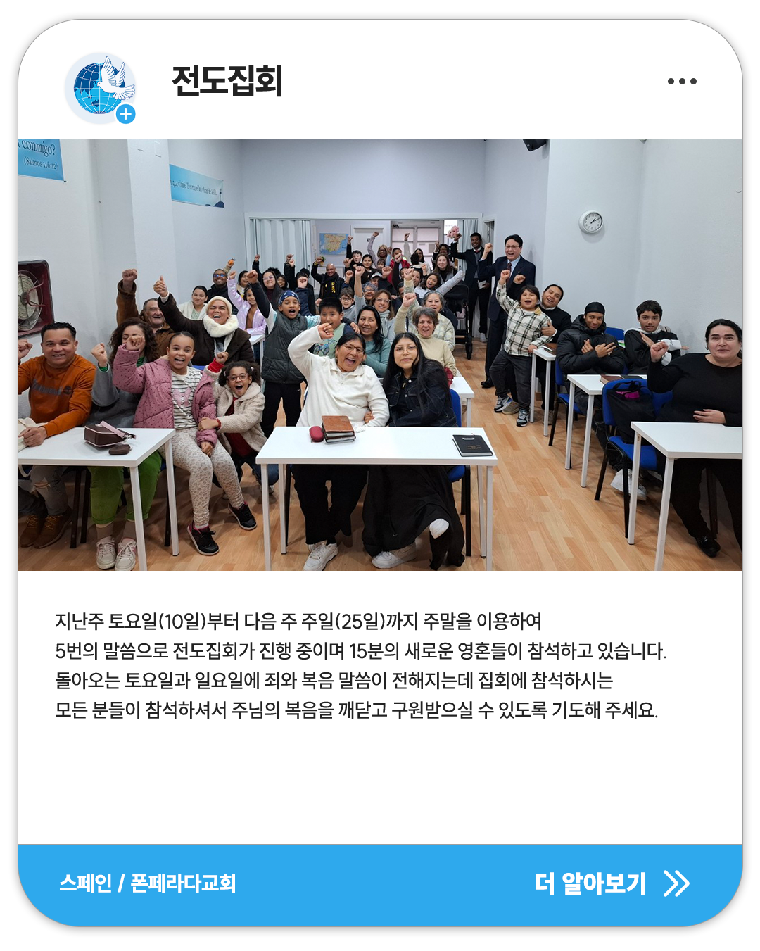 지난주 토요일(10일)부터 다음 주 주일(25일)까지 주말을 이용하여 5번의 말씀으로 전도집회가 진행 중이며 15분의 새로운 영혼들이 참석하고 있습니다.