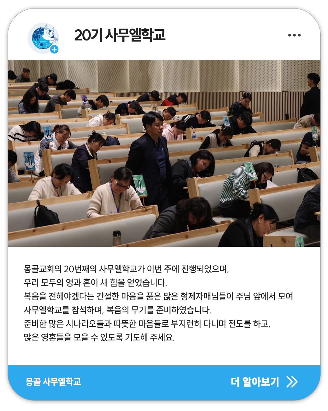 복음 전해야겠다는 간절한 마음을 품은 많은 형제자매님들이 주님 앞에서 모여 사무엘 학교를 참석하여, 복음의 무기를 준비하였습니다.