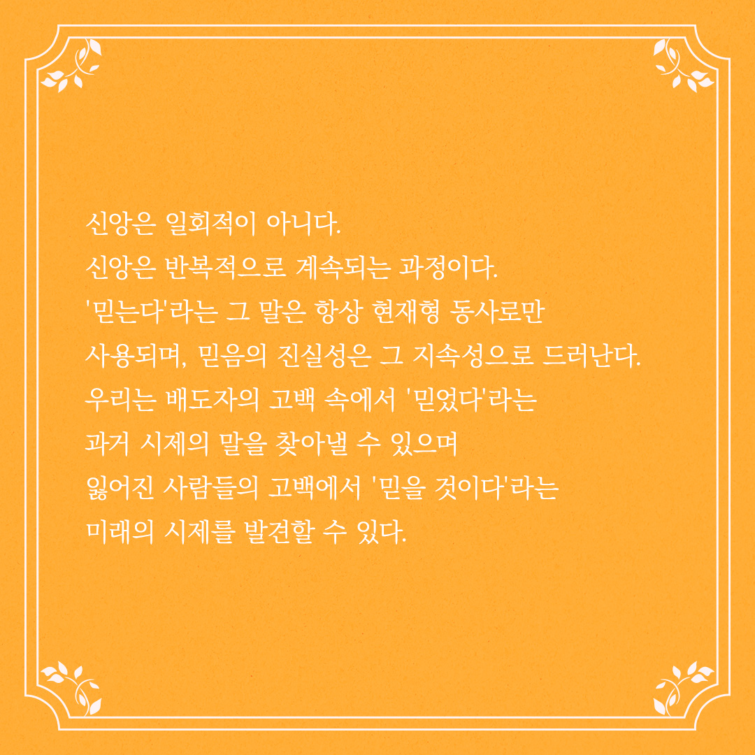 '믿는다'라는 그 말은 항상 현재형 동사로만 사용되며, 믿음의 진실성은 그 지속성으로 드러난다.