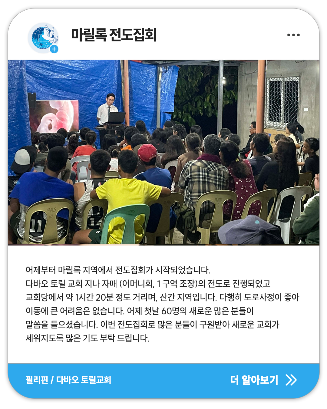 어제부터 마릴록 지역에서 전도집회가 시작되었습니다. 다바오 토릴 교회 지나 자매 (어머니회, 1 구역 조장)의 전도로 진행되었고 교회당에서 약 1시간 20분 정도 거리며, 산간 지역입니다. 다행히 도로사정이 좋아 이동에 큰 어려움은 없습니다. 어제 첫날 60명의 새로운 많은 분들이 말씀을 들으셨습니다. 이번 전도집회로 많은 분들이 구원받아 새로운 교회가 세워지도록 많은 기도 부탁 드립니다.