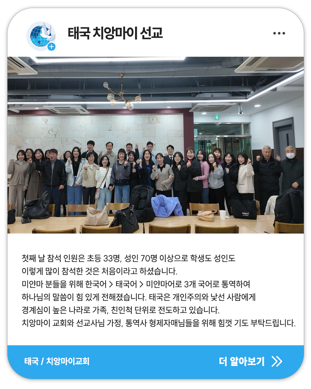 치앙마이 교회와 선교사님 가정, 통역사 형제자매님들을 위해 힘껏 기도 부탁드립니다.