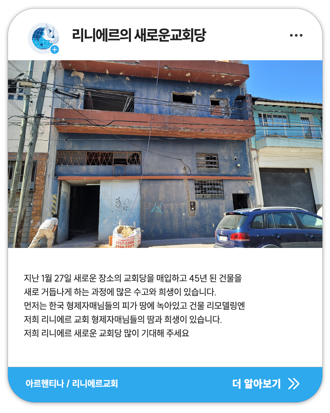 지난 1월 27일 새로운 장소의 교회당을 매입하고 45년 된 건물을 새로 거듭나게 하는 과정에 많은 수고와 희생이 있습니다. 먼저는 한국 형제자매님들의 피가 땅에 녹아있고 건물 리모델링엔 저희 리니에르 교회 형제자매님들의 땀과 희생이 있습니다. 저희 리니에르 새로운 교회당 많이 기대해 주세요