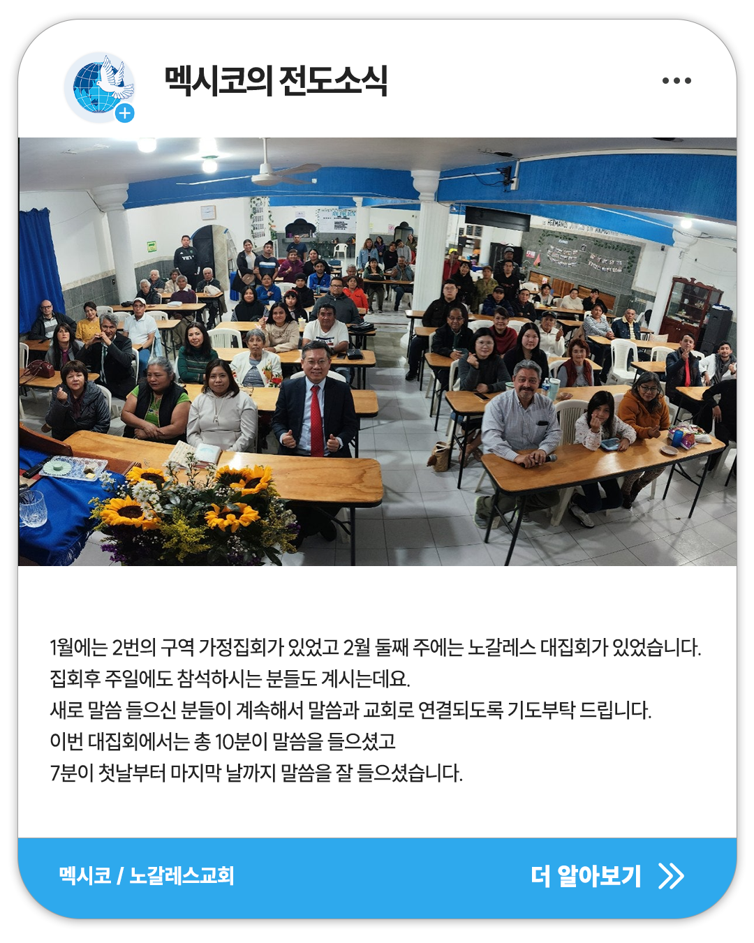 3.3~13 자매교회인 동탄교회 선교팀과 목사님께서 메리다교회를 방문하여 한 주간 전도 집회 말씀을 전해주셨습니다. 총 15명의 영혼이 말씀을 들었고 4-5명이 구원을 받았습니다. 서로 사랑 가운데 함께하면서 메리다교회 형제자매님들이 섬김에 대하며 많이 배우는 시간이었습니다. 또한 같은 마음으로 복음 전하는 시간 가운데 새로운 영혼이 탄생하는 하나님의 역사를 체험하는 귀한 시간이었습니다.
